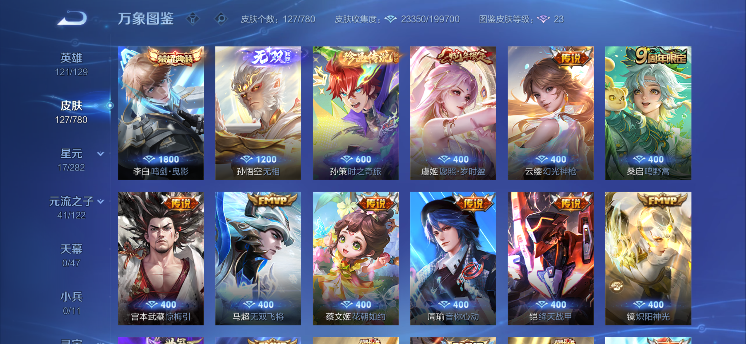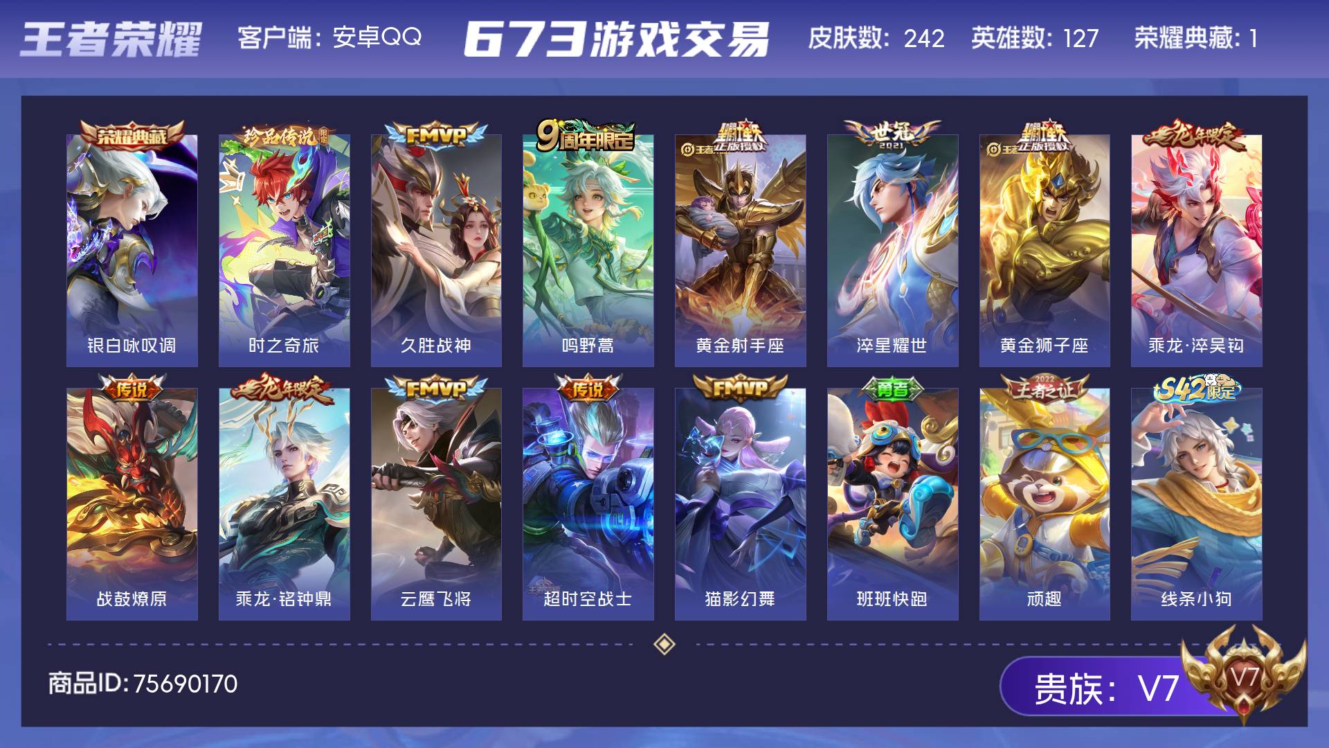 V7 皮肤242 英雄127 至尊星耀 荣耀典藏1 珍品传说1 星传说1 传说11 其他皮肤233