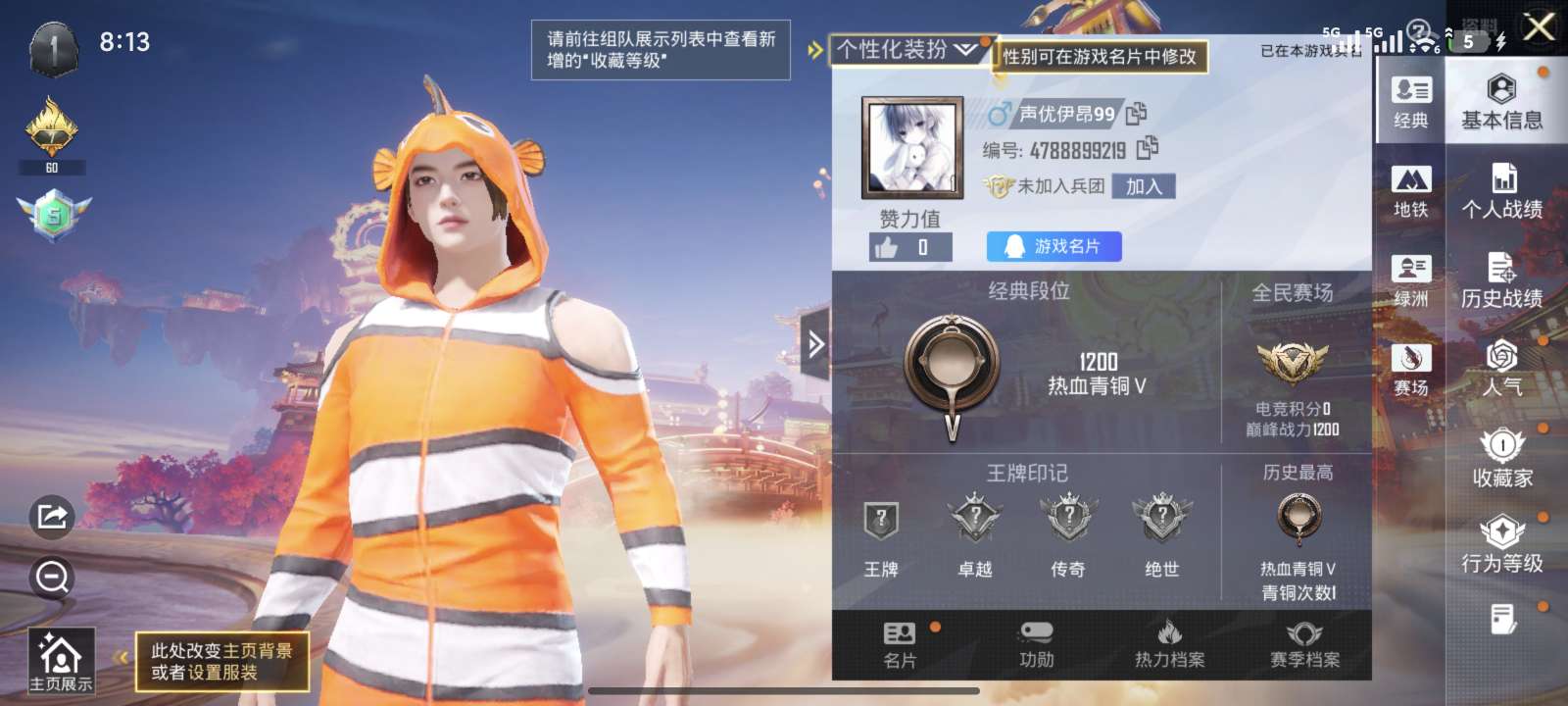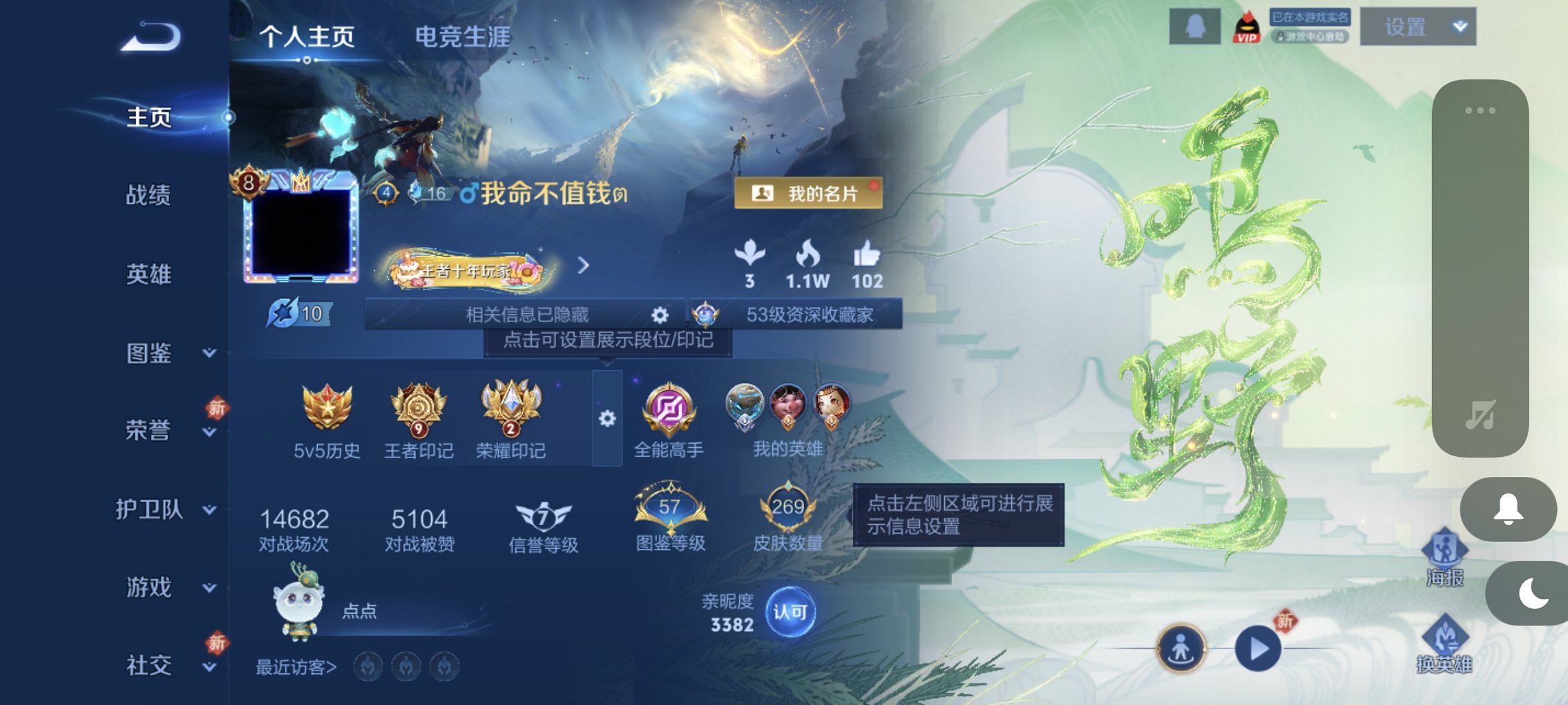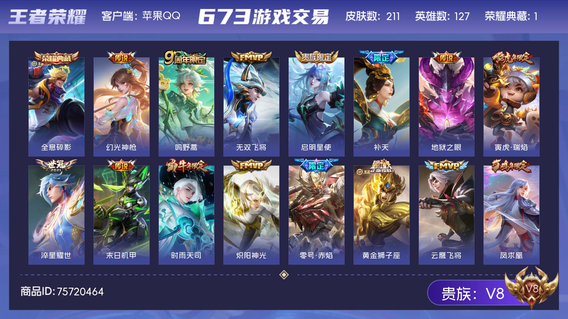 贵族等级: V8 英雄数: 128 皮肤数: 289 荣耀水晶: 九霄神辉 星