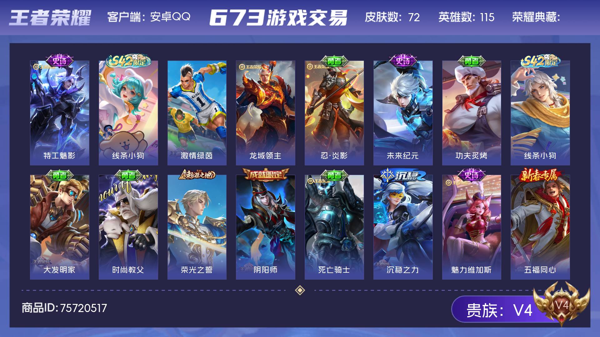 V4 皮肤72 英雄115 永恒钻石 其他皮肤78