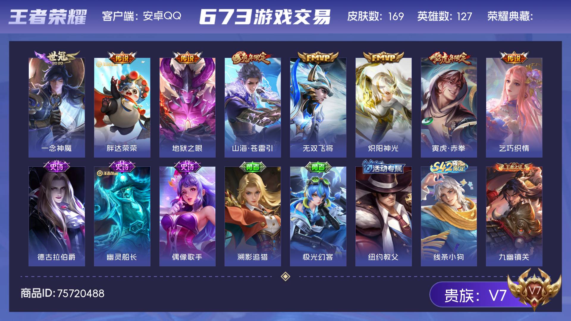 V7 皮肤169 英雄127 非凡王者 星传说1 传说8 其他皮肤166