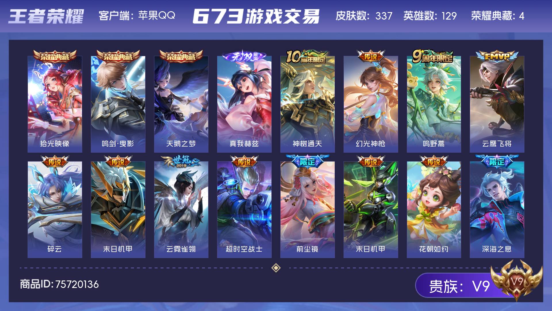 V9 皮肤337 英雄129 绝世王者 荣耀典藏4 无双皮肤1 星传说3 传说28 其他皮肤310