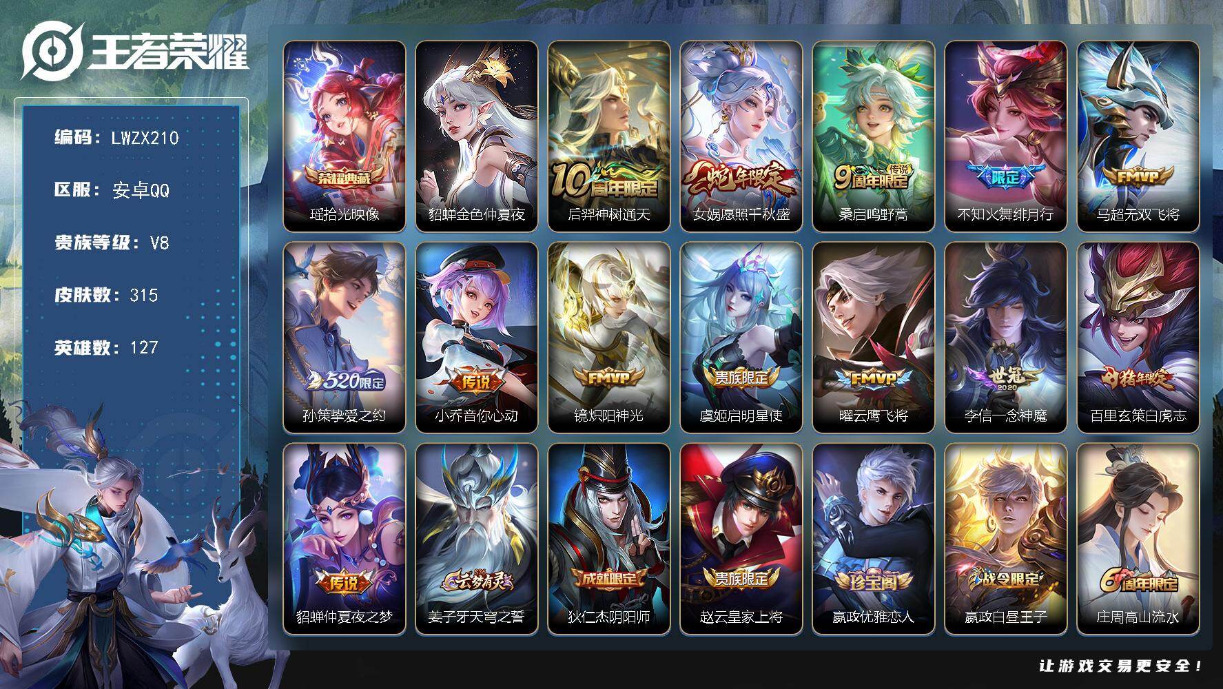 可二次【特价出售/店主推荐】安卓Q-V8-最强王者段位-127英雄-315皮肤