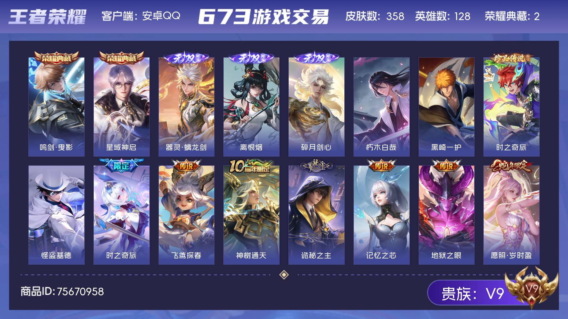 V9 皮肤358 英雄128 荣耀王者 荣耀典藏2 无双皮肤3 珍品传说4 星传说5 传说31 其他皮肤323