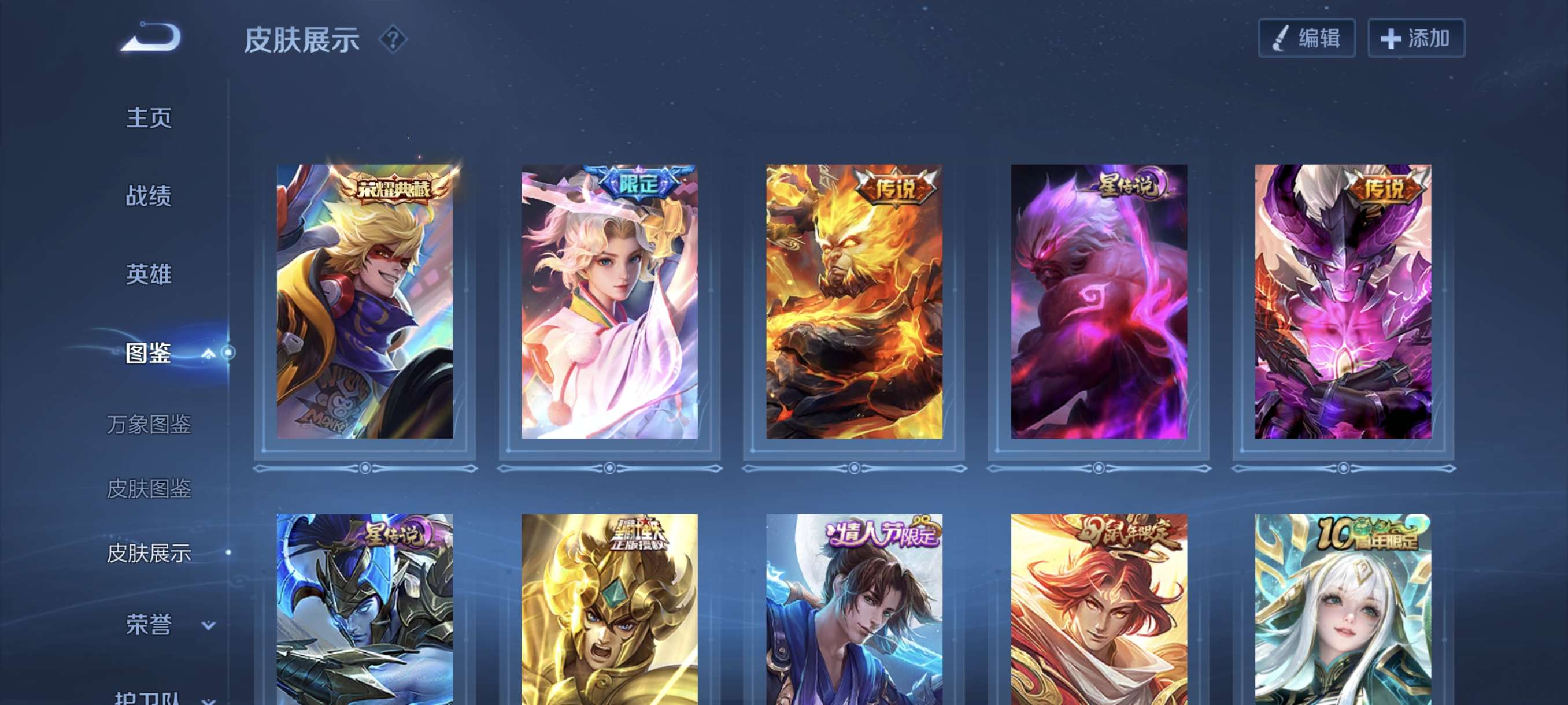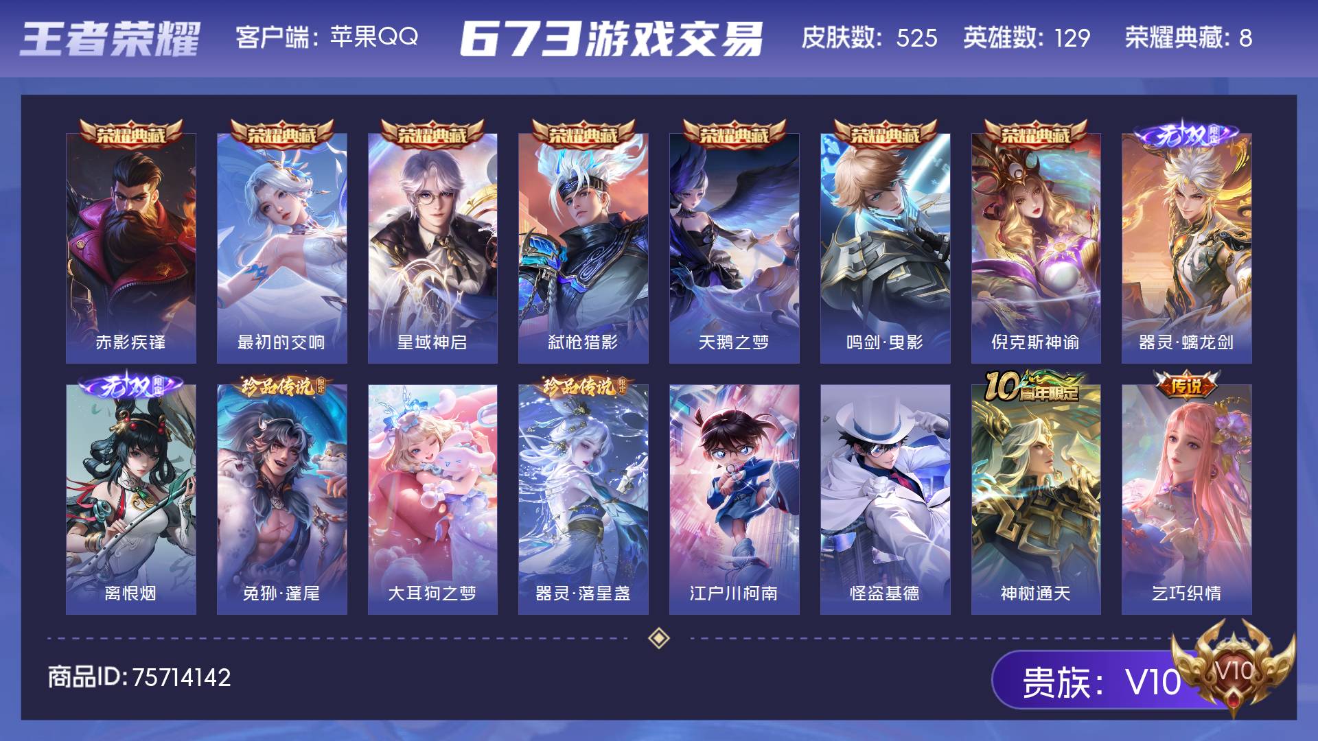 V10 皮肤525 英雄129 至尊星耀 荣耀典藏8 无双皮肤2 珍品传说5 传说49 其他皮肤467