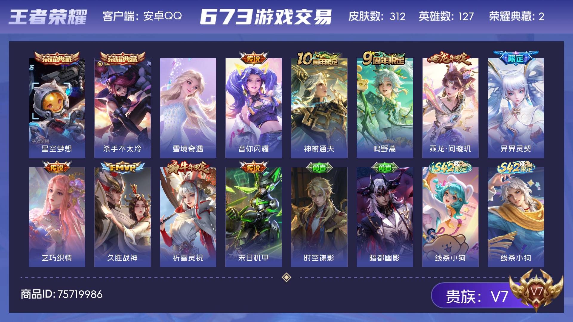 V7 皮肤312 英雄127 非凡王者 荣耀典藏2 无双皮肤1 传说9 其他皮肤306