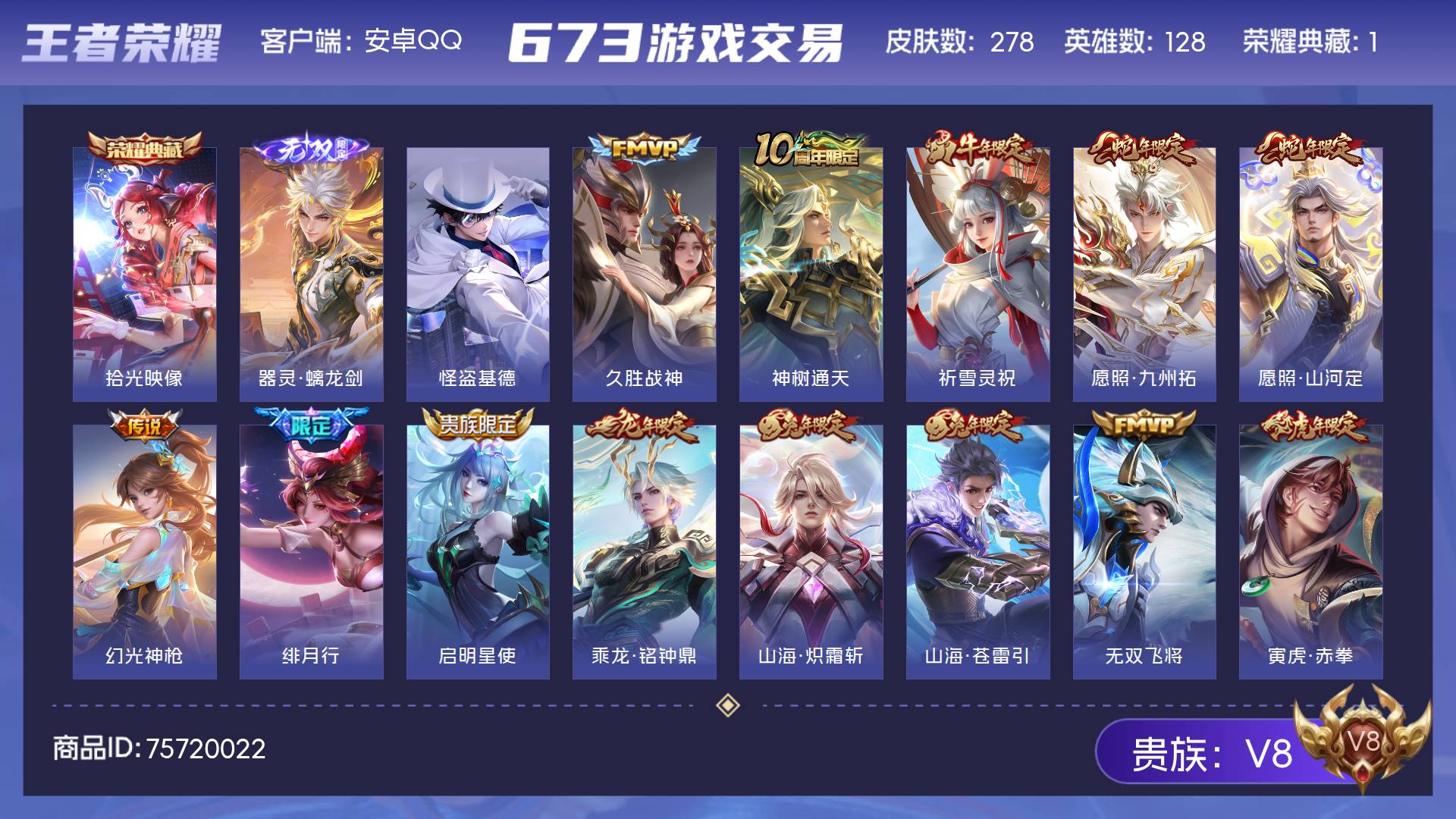 V8 皮肤278 英雄128 至尊星耀 荣耀典藏1 无双皮肤1 珍品传说1 传说20 其他皮肤261