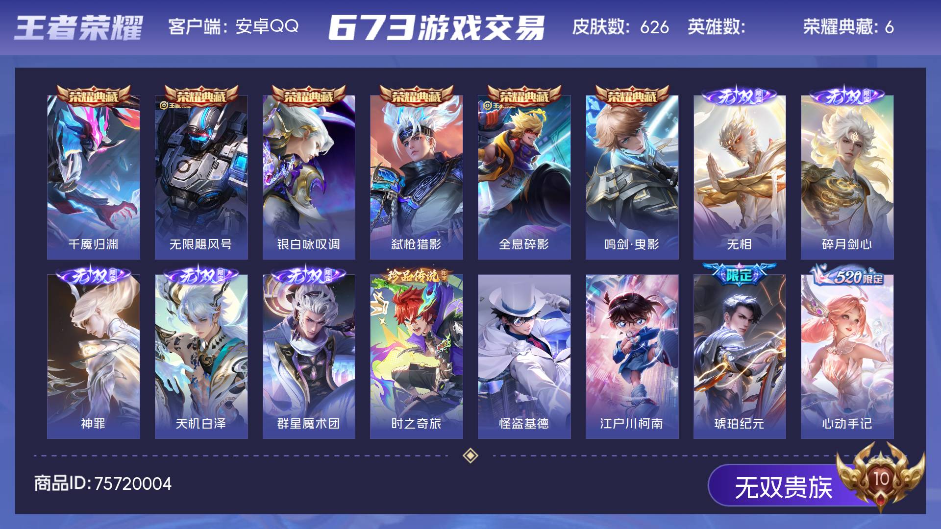 无双贵族 皮肤626 非凡王者 荣耀典藏6 无双皮肤5 珍品传说3 传说99 其他皮肤517