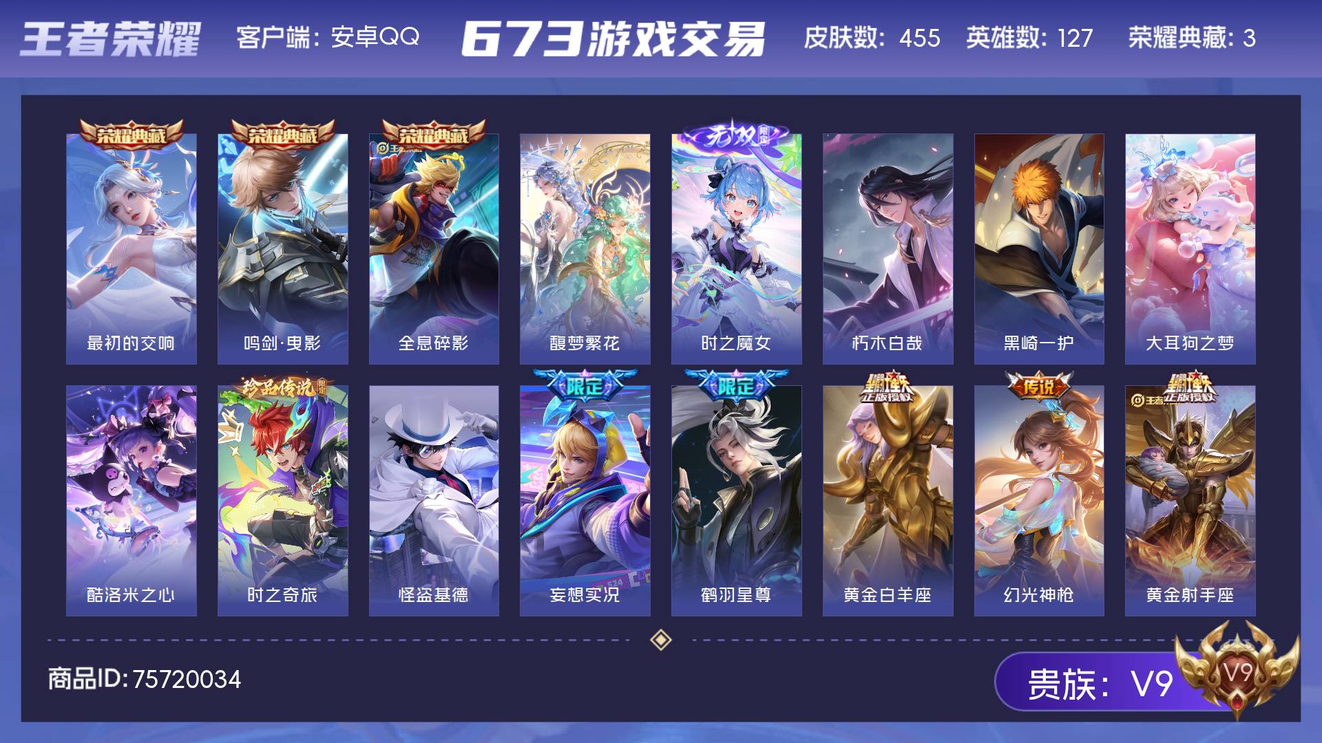V9 皮肤455 英雄127 最强王者 荣耀典藏3 珍品无双1 无双皮肤1 珍品传说6 传说39 其他皮肤411