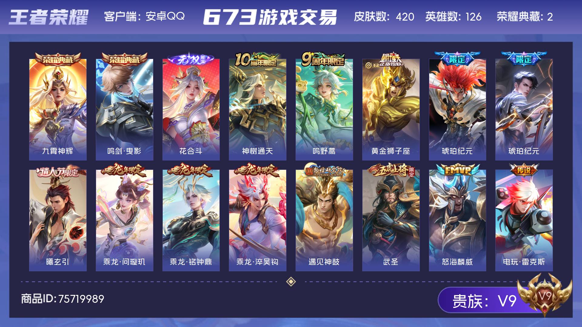 V9 皮肤420 英雄126 至尊星耀 荣耀典藏2 无双皮肤1 传说37 其他皮肤386