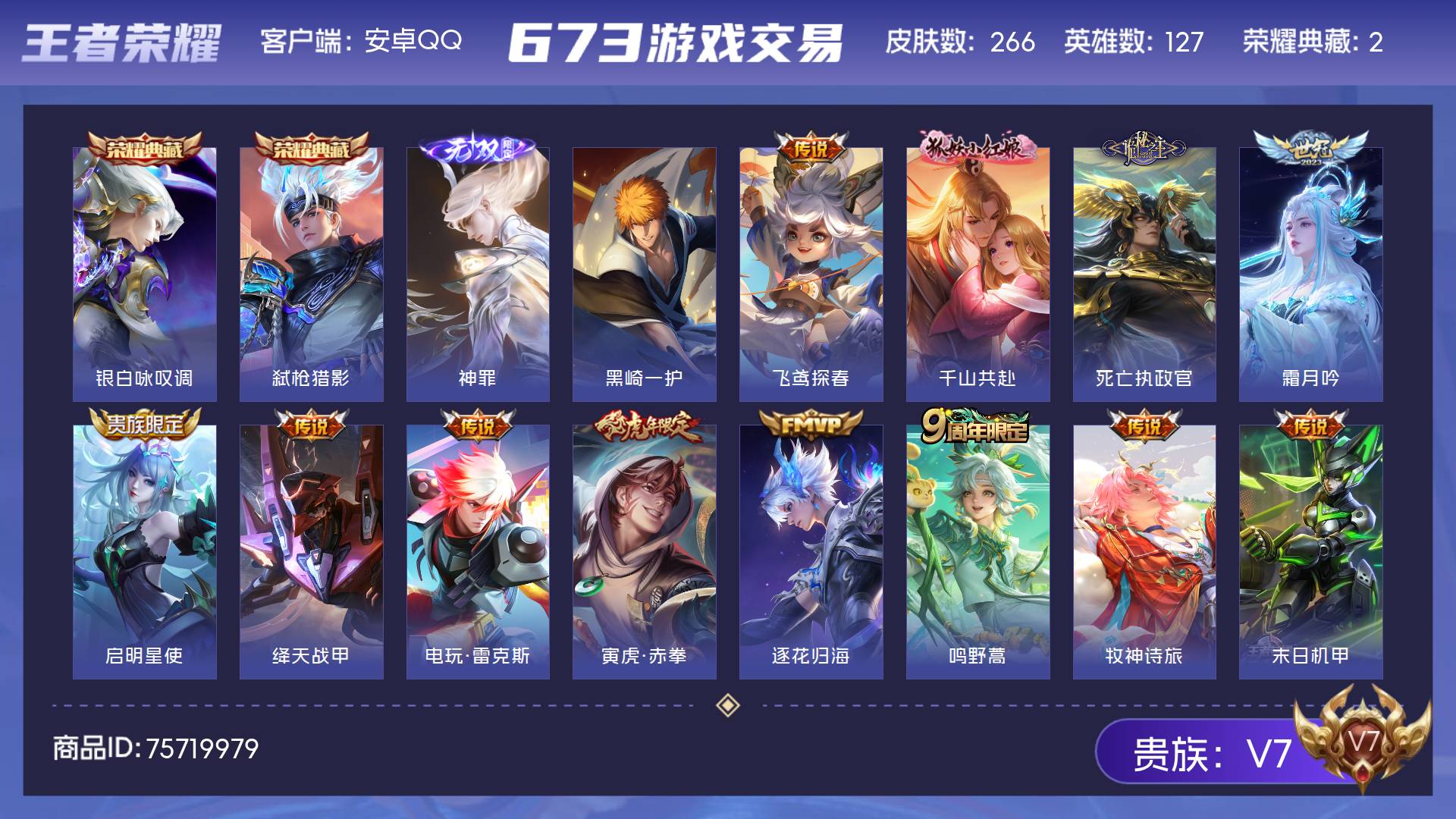 V7 皮肤266 英雄127 最强王者 荣耀典藏2 无双皮肤1 珍品传说1 传说23 其他皮肤245