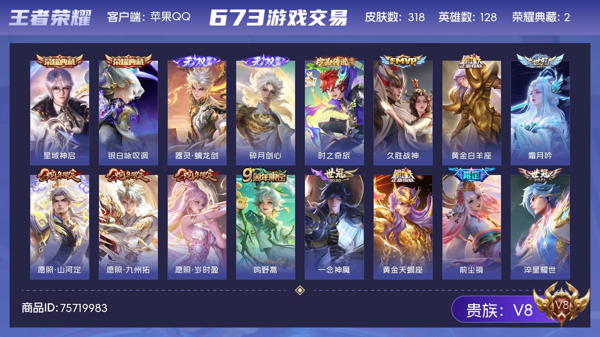V8 皮肤318 英雄128 绝世王者 荣耀典藏2 无双皮肤2 珍品传说1 传说16 其他皮肤302