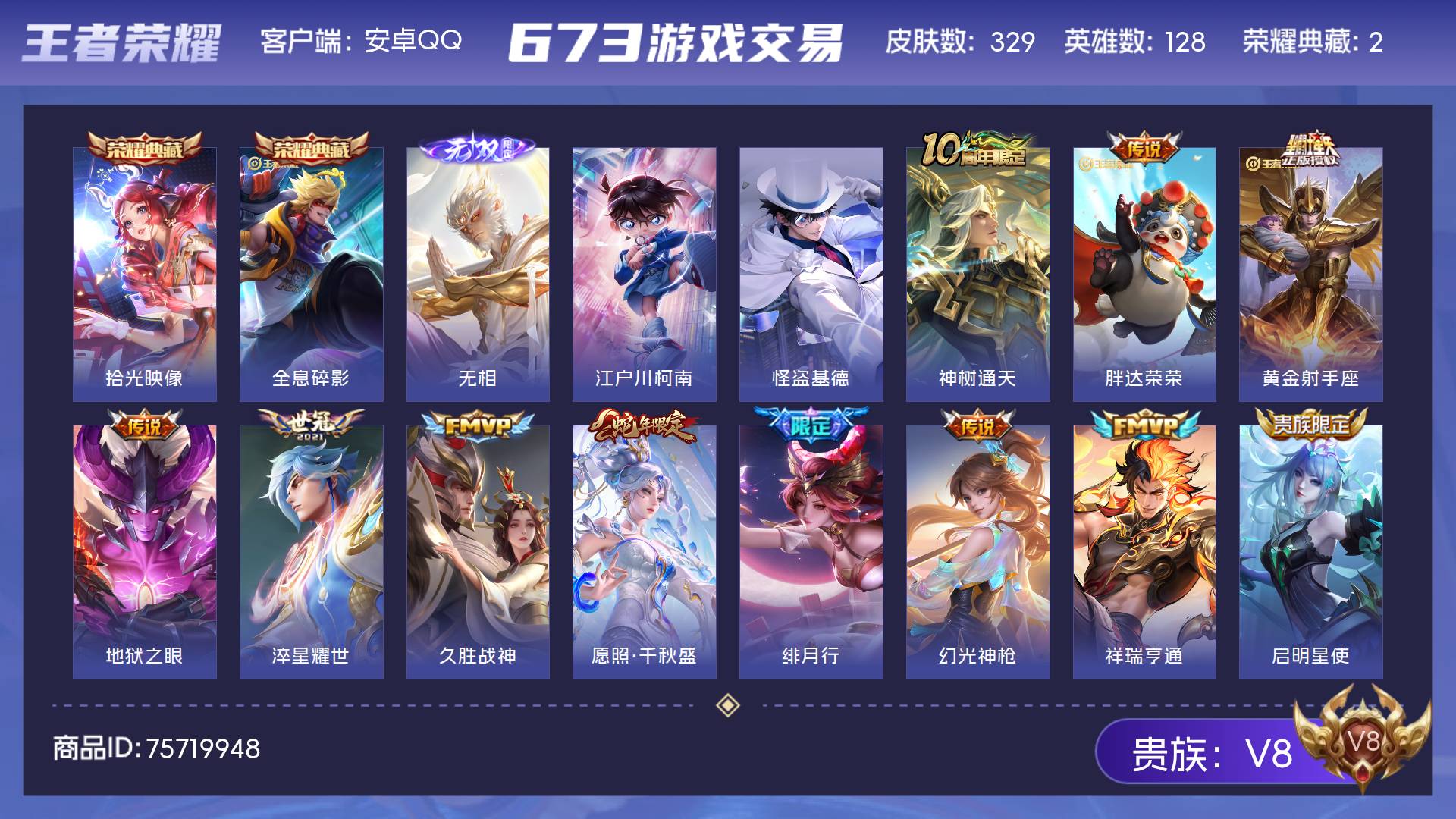 V8 皮肤329 英雄128 绝世王者 荣耀典藏2 无双皮肤1 珍品传说2 传说18 其他皮肤312