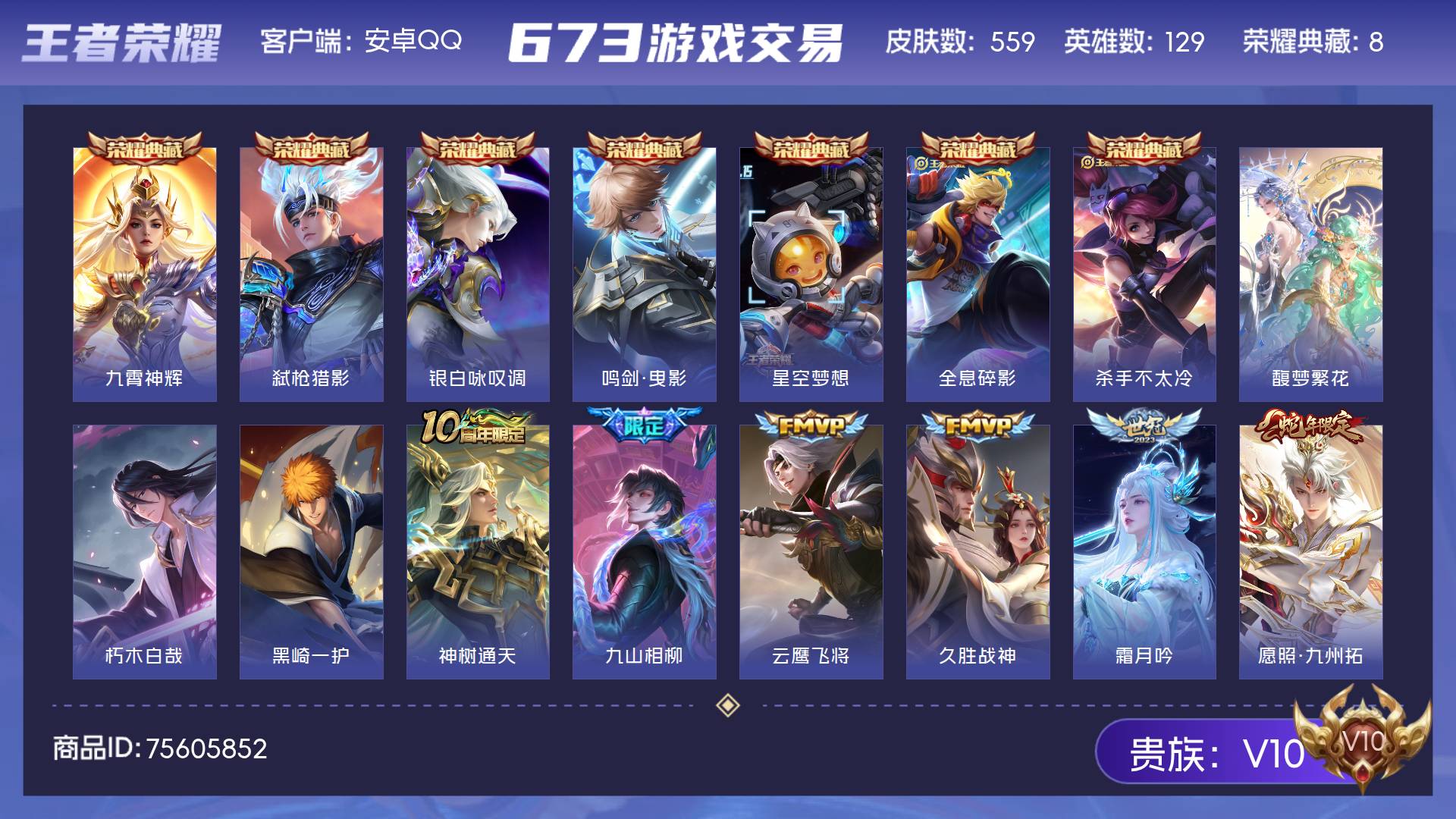 V10 皮肤559 英雄129 非凡王者 荣耀典藏8 珍品无双1 珍品传说2 传说62 其他皮肤491