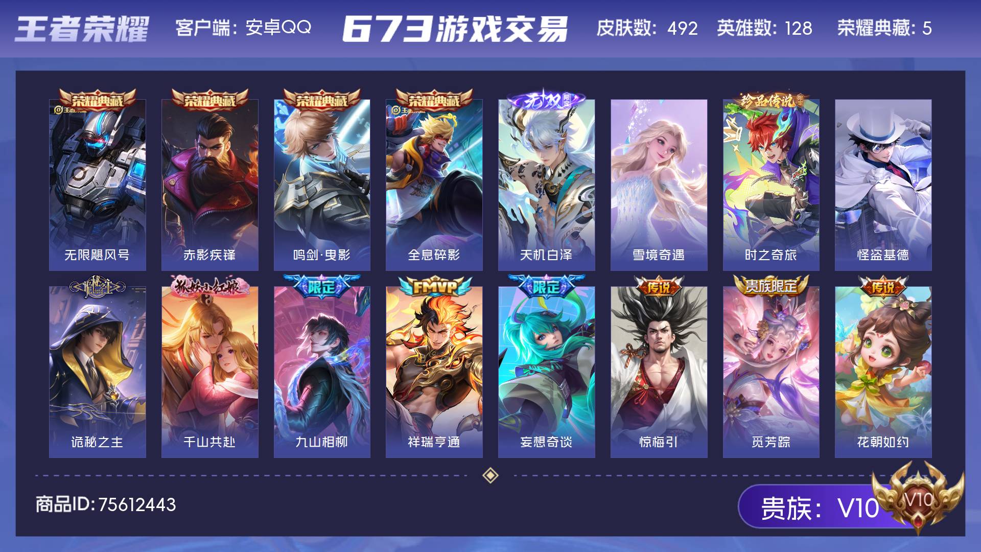 V10 皮肤492 英雄128 最强王者 荣耀典藏5 无双皮肤2 珍品传说2 传说46 其他皮肤443
