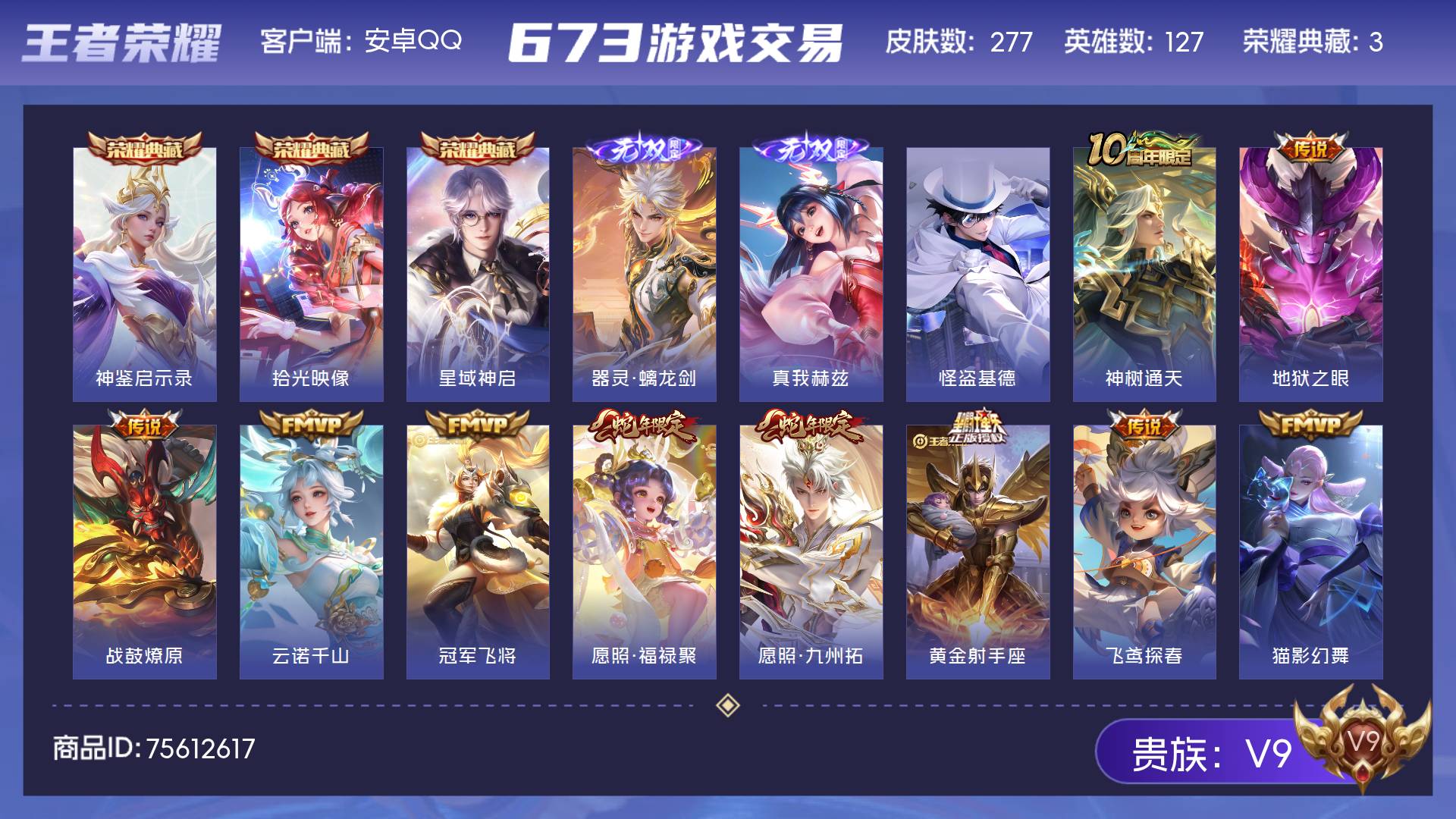 V9 皮肤277 英雄127 永恒钻石 荣耀典藏3 无双皮肤2 珍品传说1 传说27 其他皮肤249
