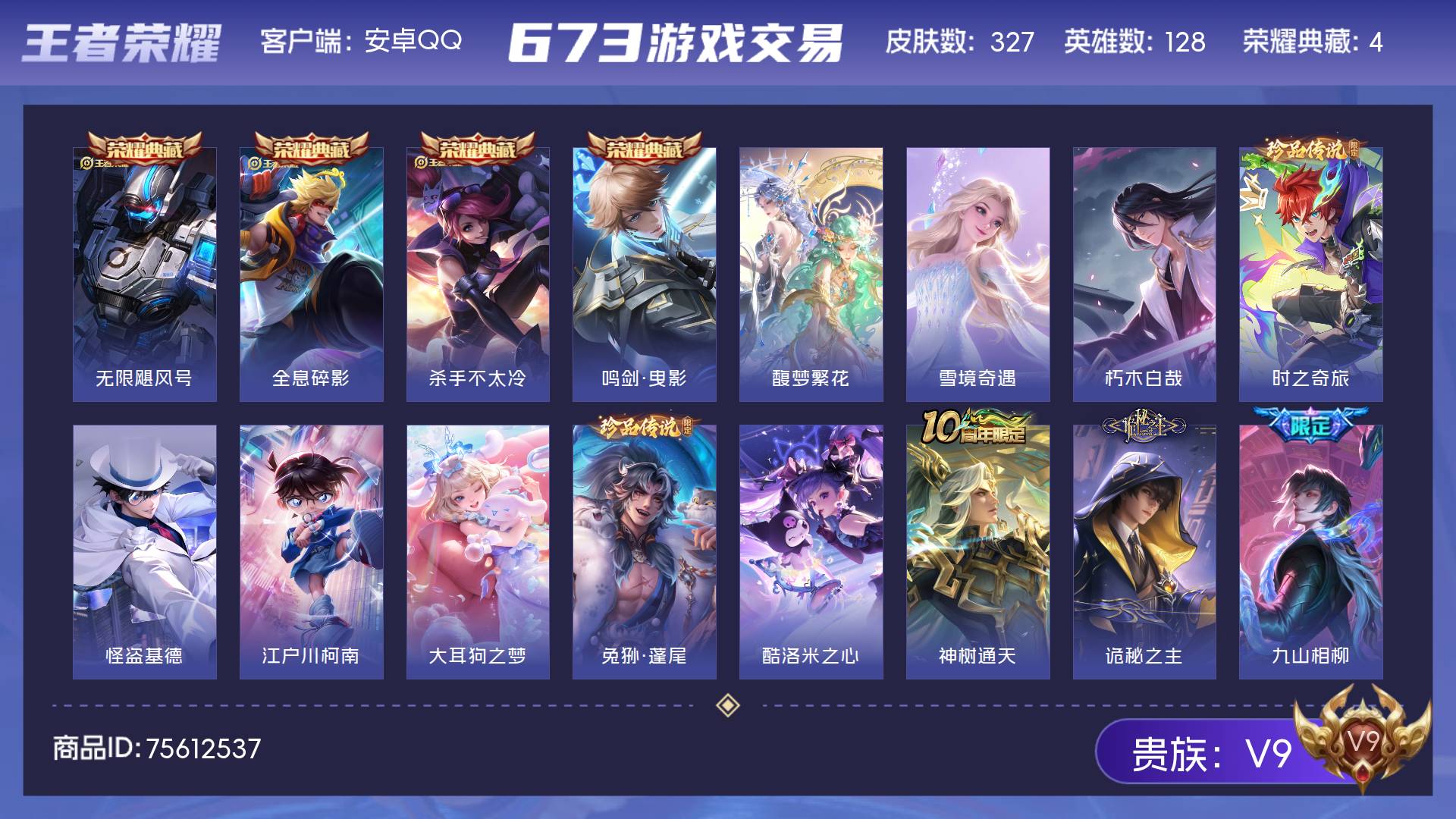 V9 皮肤327 英雄128 最强王者 荣耀典藏4 珍品无双1 无双皮肤1 珍品传说7 传说22 其他皮肤299
