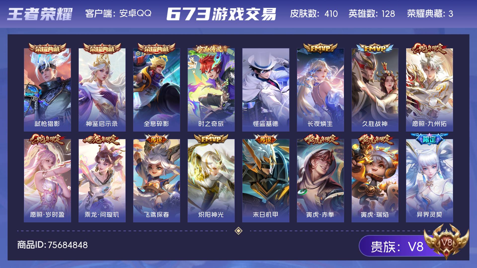 V8 皮肤410 英雄128 至尊星耀 荣耀典藏3 珍品传说2 传说26 其他皮肤384