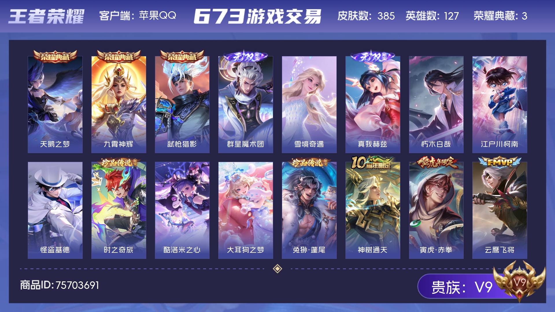 V9 皮肤385 英雄127 最强王者 荣耀典藏3 无双皮肤3 珍品传说7 传说22 其他皮肤356