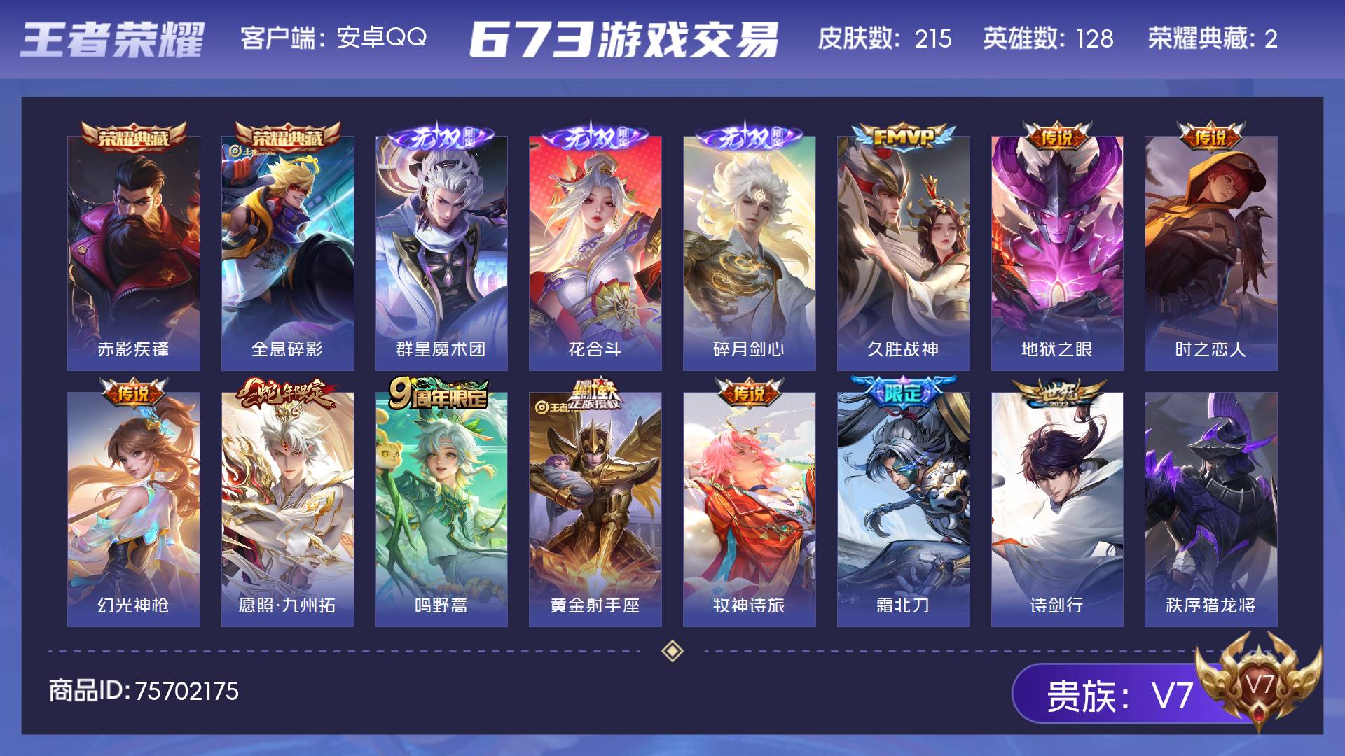 V7 皮肤215 英雄128 永恒钻石 荣耀典藏2 无双皮肤3 传说10 其他皮肤206