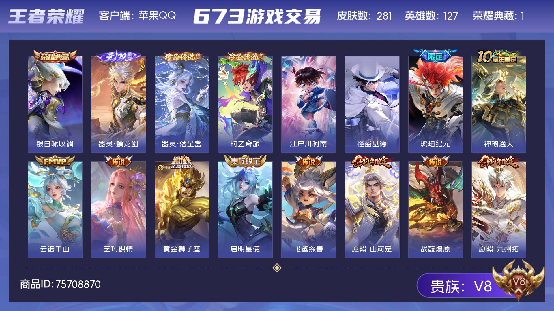 V8 皮肤281 英雄127 至尊星耀 荣耀典藏1 无双皮肤1 珍品传说4 传说19 其他皮肤261