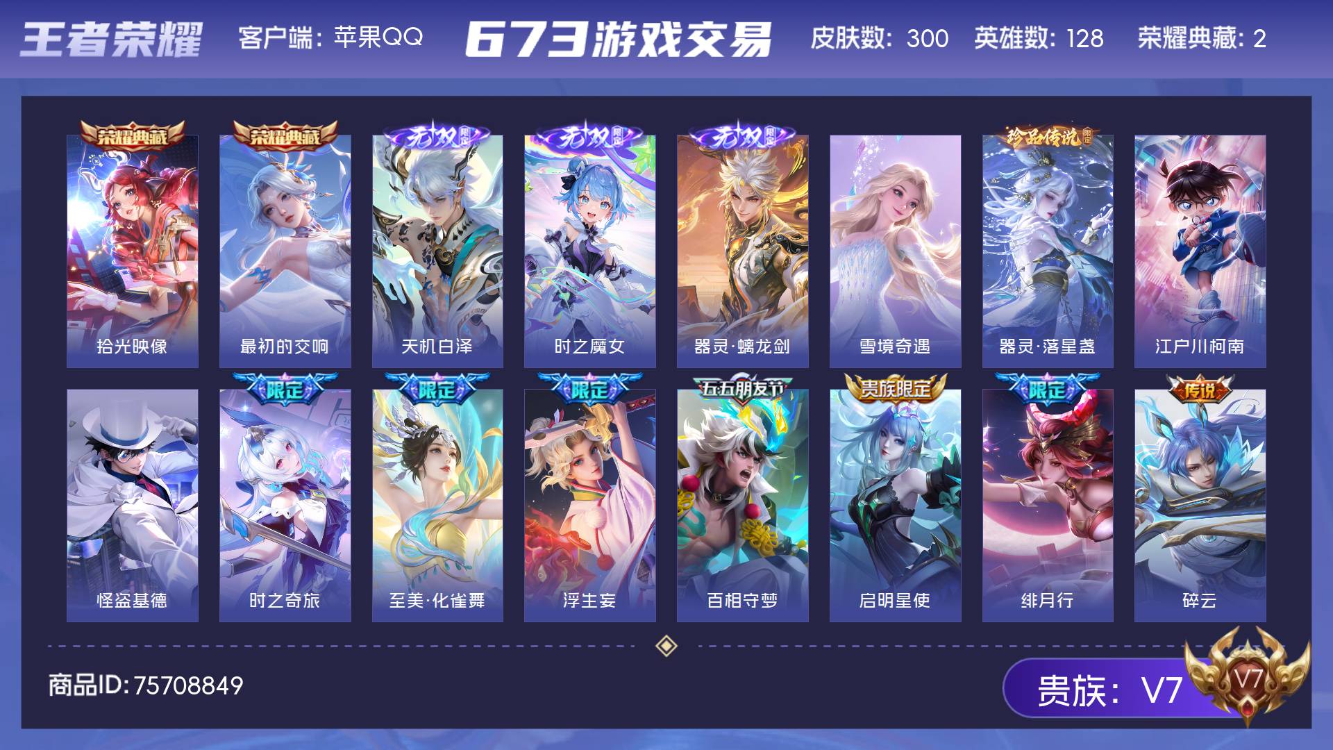 V7 皮肤300 英雄128 至尊星耀 荣耀典藏2 无双皮肤4 珍品传说3 传说23 其他皮肤274