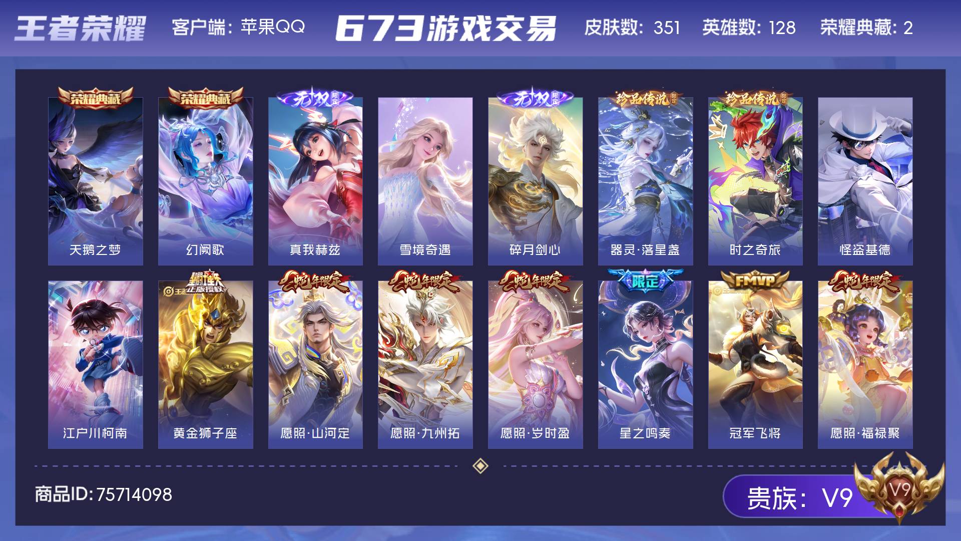 V9 皮肤351 英雄128 绝世王者 荣耀典藏2 无双皮肤3 珍品传说4 传说28 其他皮肤320