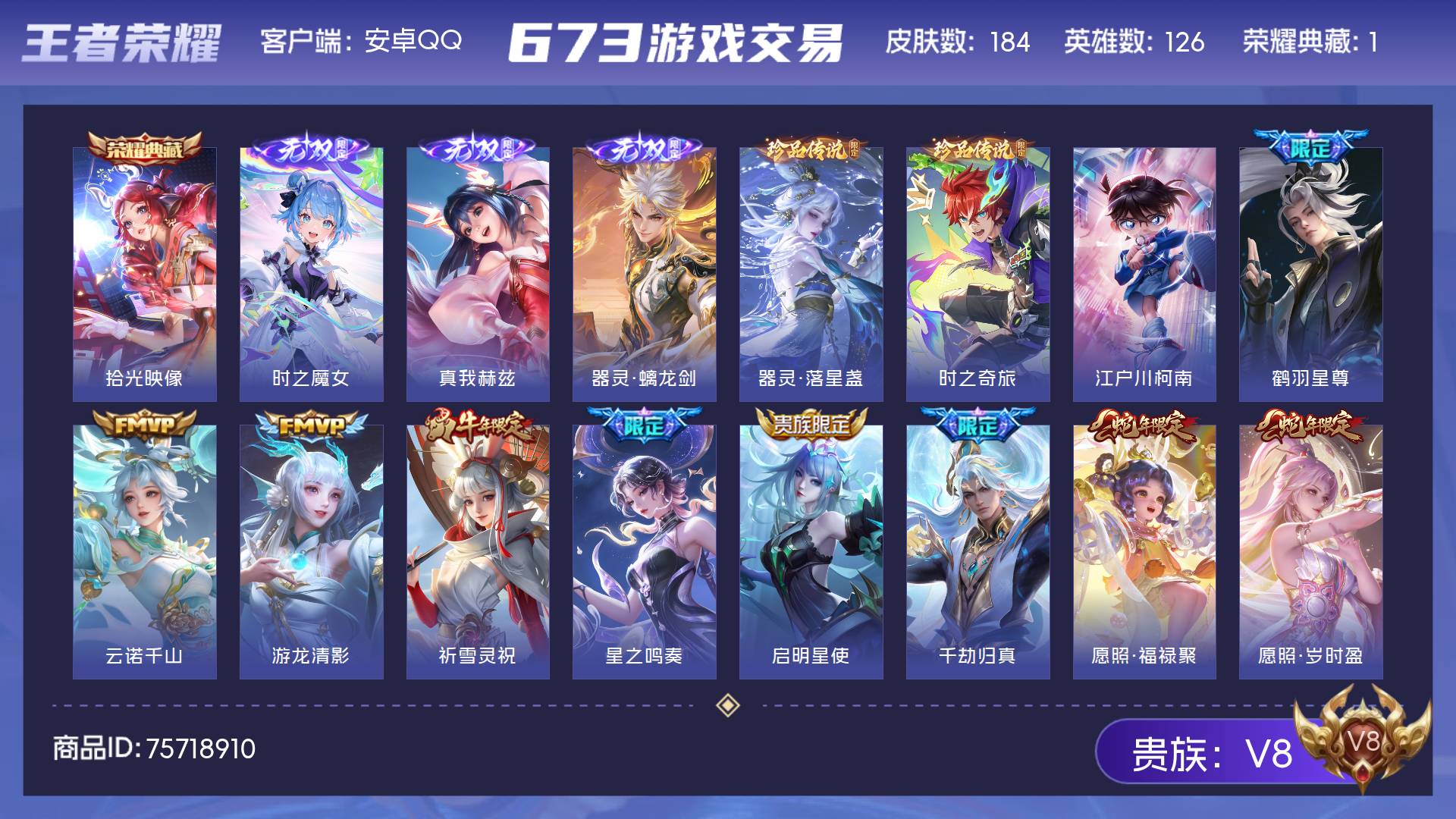 V8 皮肤184 英雄126 永恒钻石 荣耀典藏1 无双皮肤3 珍品传说3 传说18 其他皮肤165