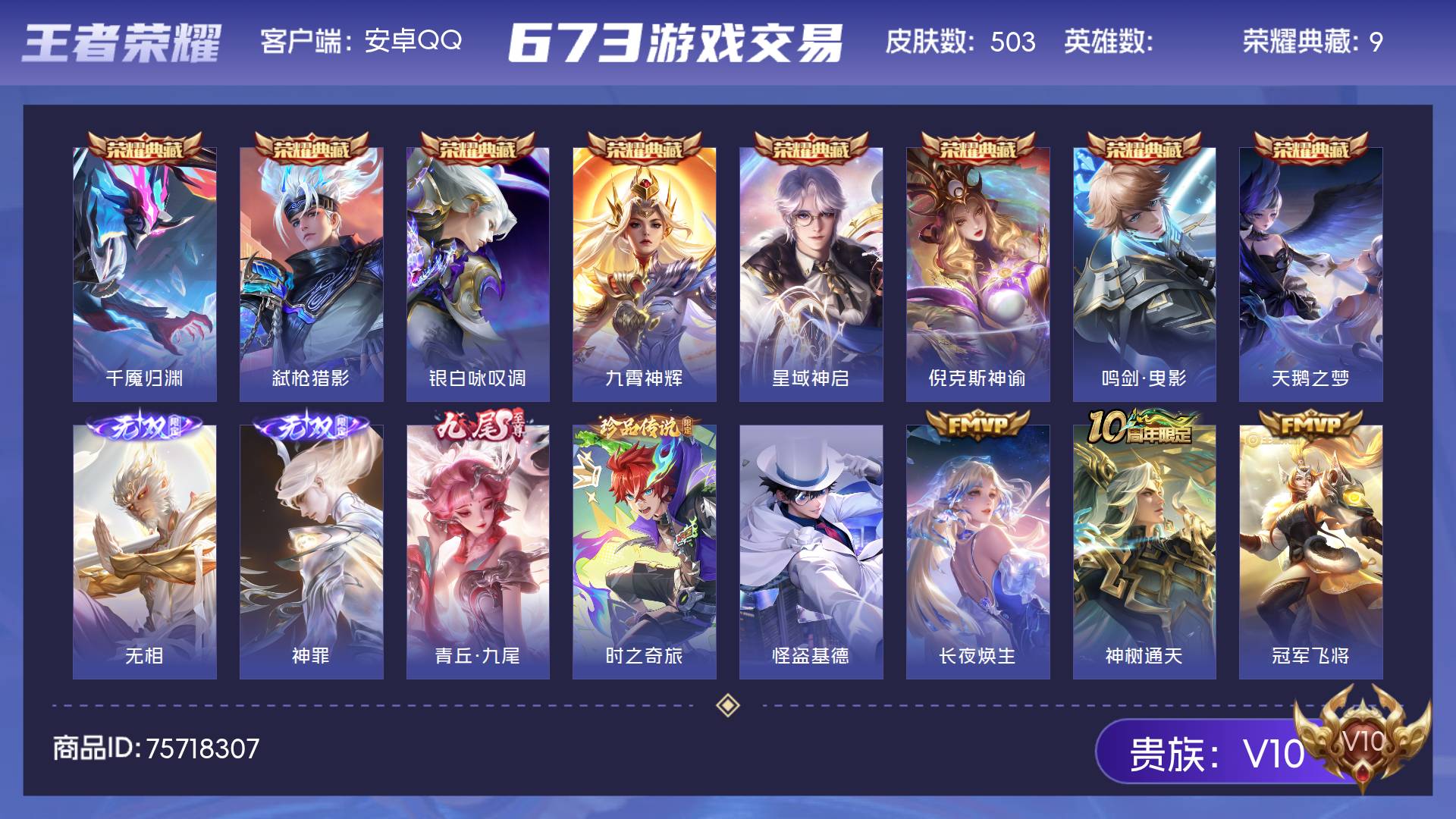 V10 皮肤503 至尊星耀 荣耀典藏9 无双皮肤3 珍品传说2 传说72 其他皮肤423