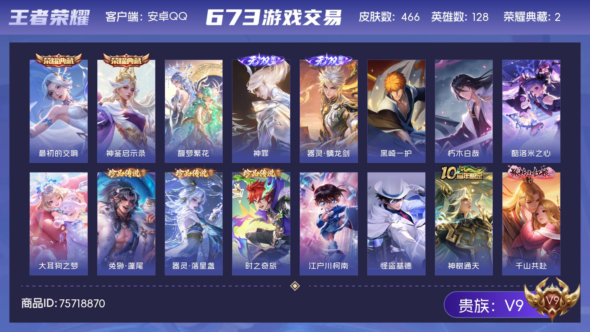 V9 皮肤466 英雄128 荣耀王者 荣耀典藏2 珍品无双1 无双皮肤2 珍品传说9 传说38 其他皮肤420