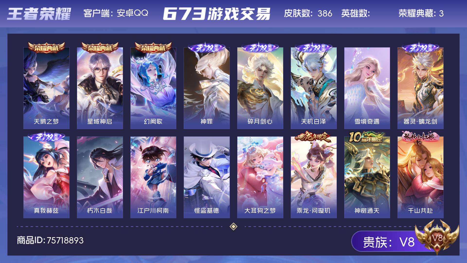 V8 皮肤386 最强王者 荣耀典藏3 无双皮肤6 珍品传说4 传说22 其他皮肤356