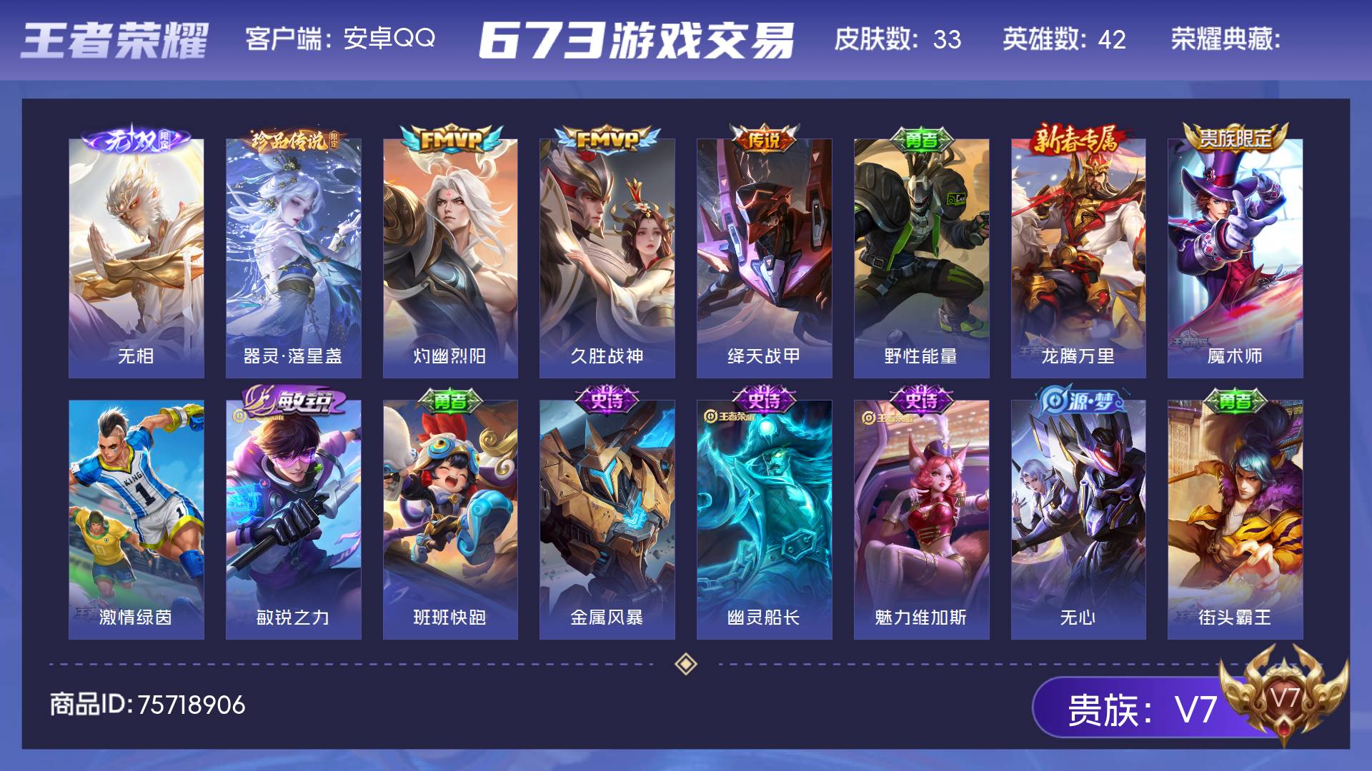 V7 皮肤33 英雄42 最强王者 无双皮肤1 珍品传说1 传说3 其他皮肤27