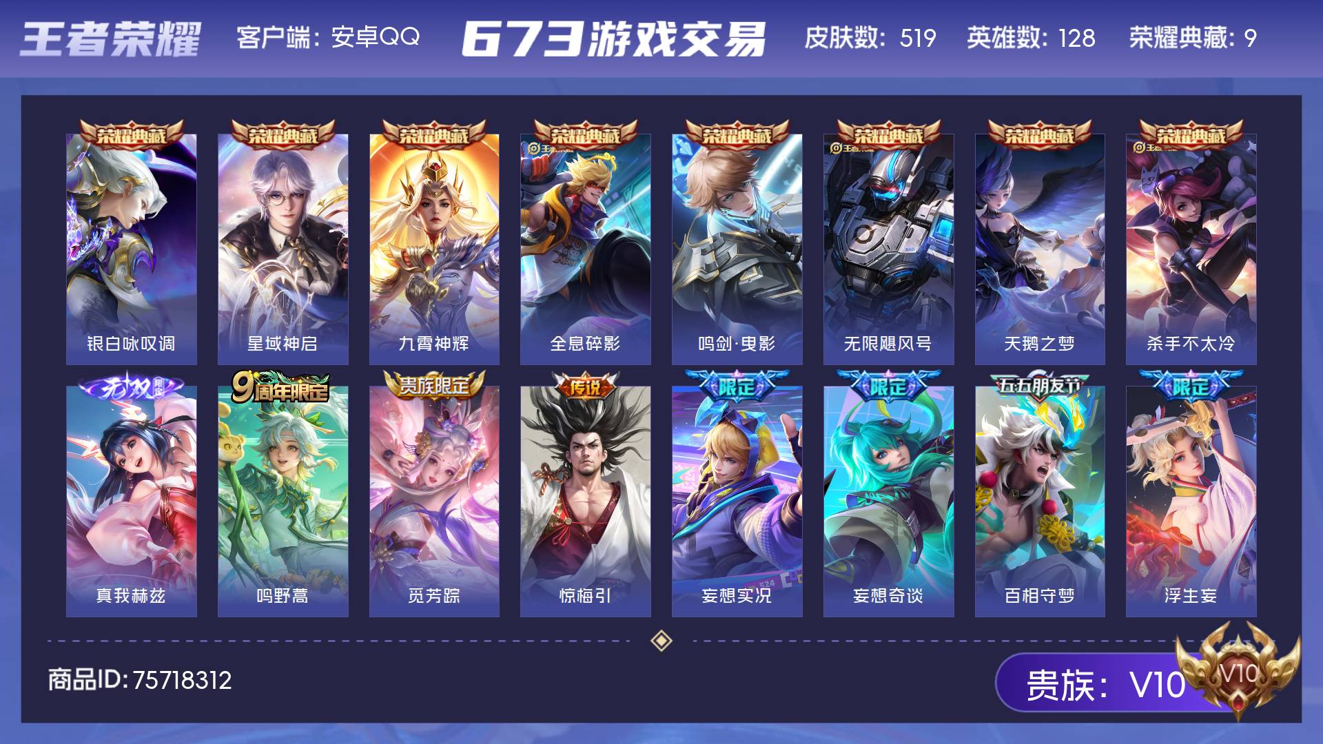 V10 皮肤519 英雄128 非凡王者 荣耀典藏9 无双皮肤1 传说67 其他皮肤448