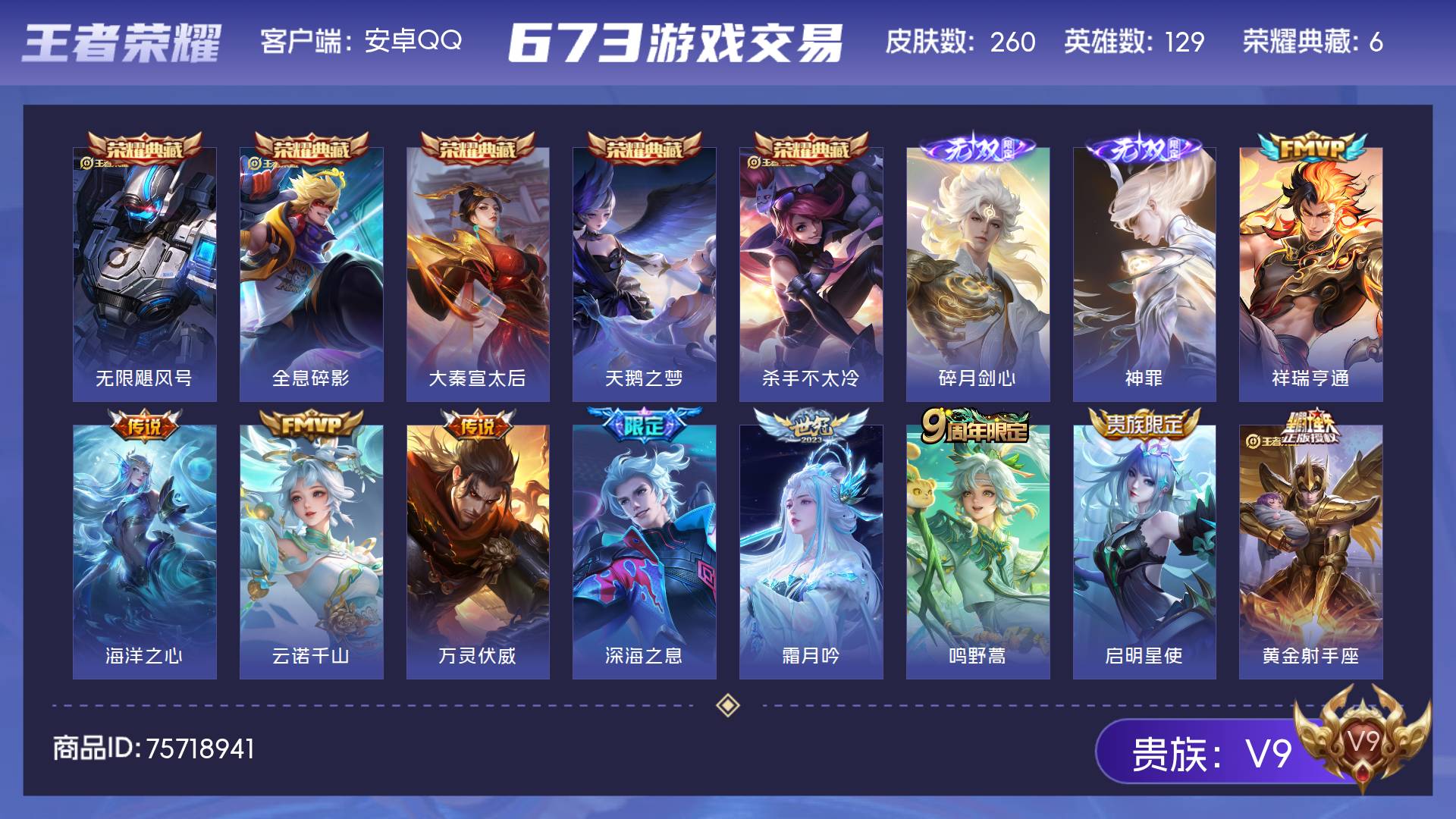 V9 皮肤260 英雄129 至尊星耀 荣耀典藏6 无双皮肤2 传说9 其他皮肤249