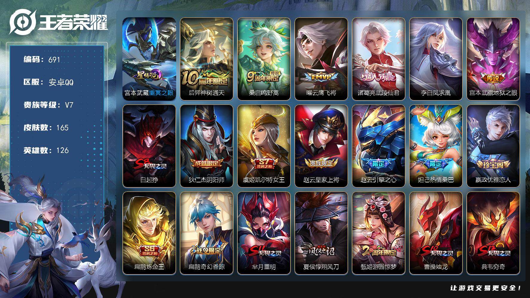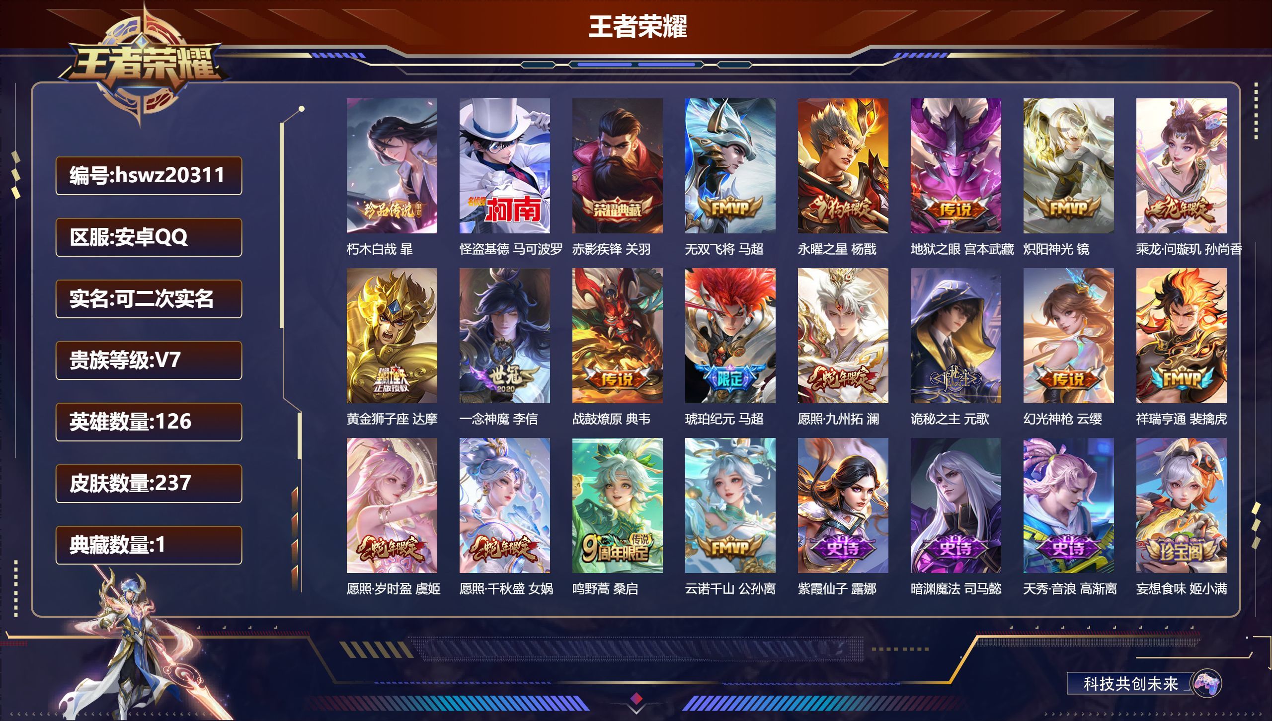 安卓QQ-1典藏-7传说-279皮肤-126英雄-荣耀黄金-一典藏,七传说多款史诗,皮肤多