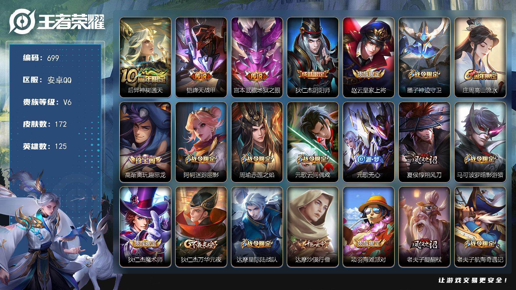 安卓Q-V3-最强王者段位-125英雄-179皮肤-3传说-43史诗-1星传说