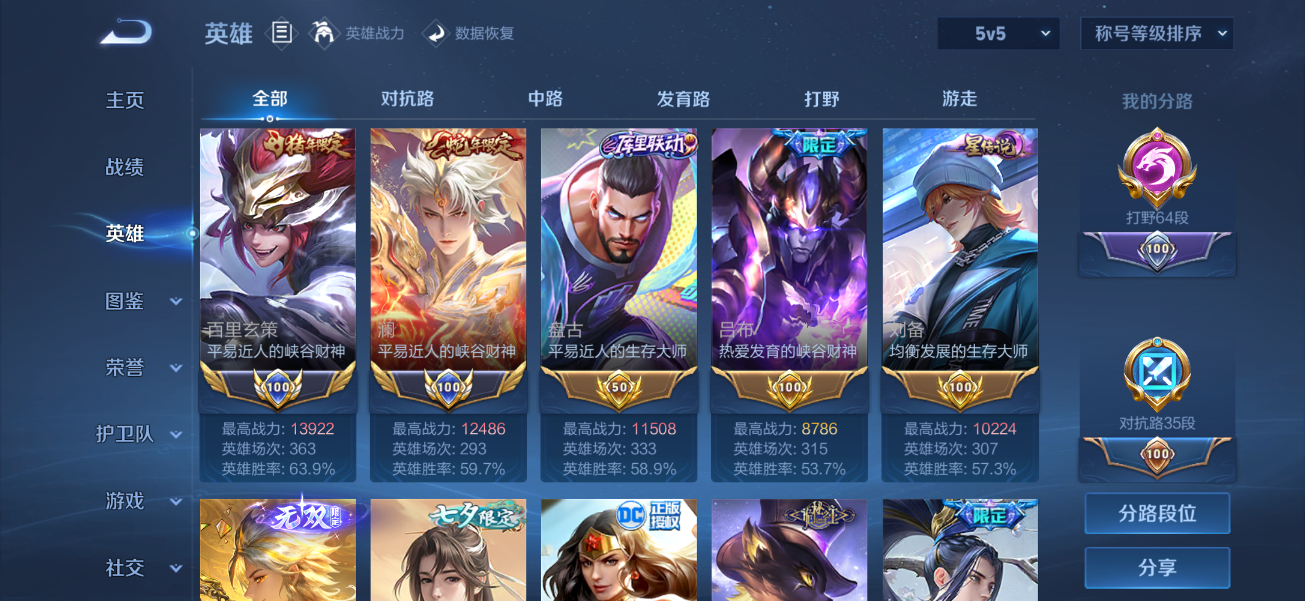 可二次【V10 512皮肤5水晶1无双1珍品6星元68传说