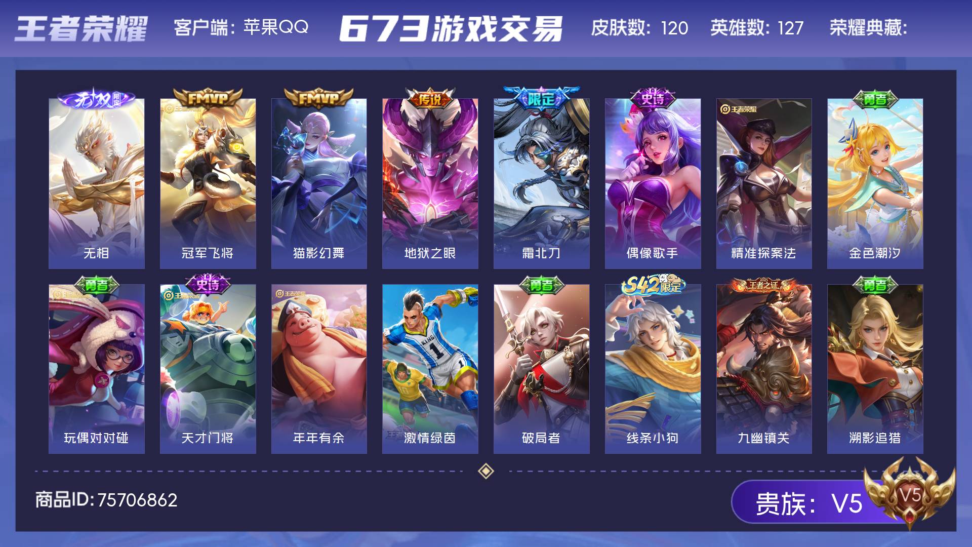 V5 皮肤120 英雄127 最强王者 无双皮肤1 传说4 其他皮肤119