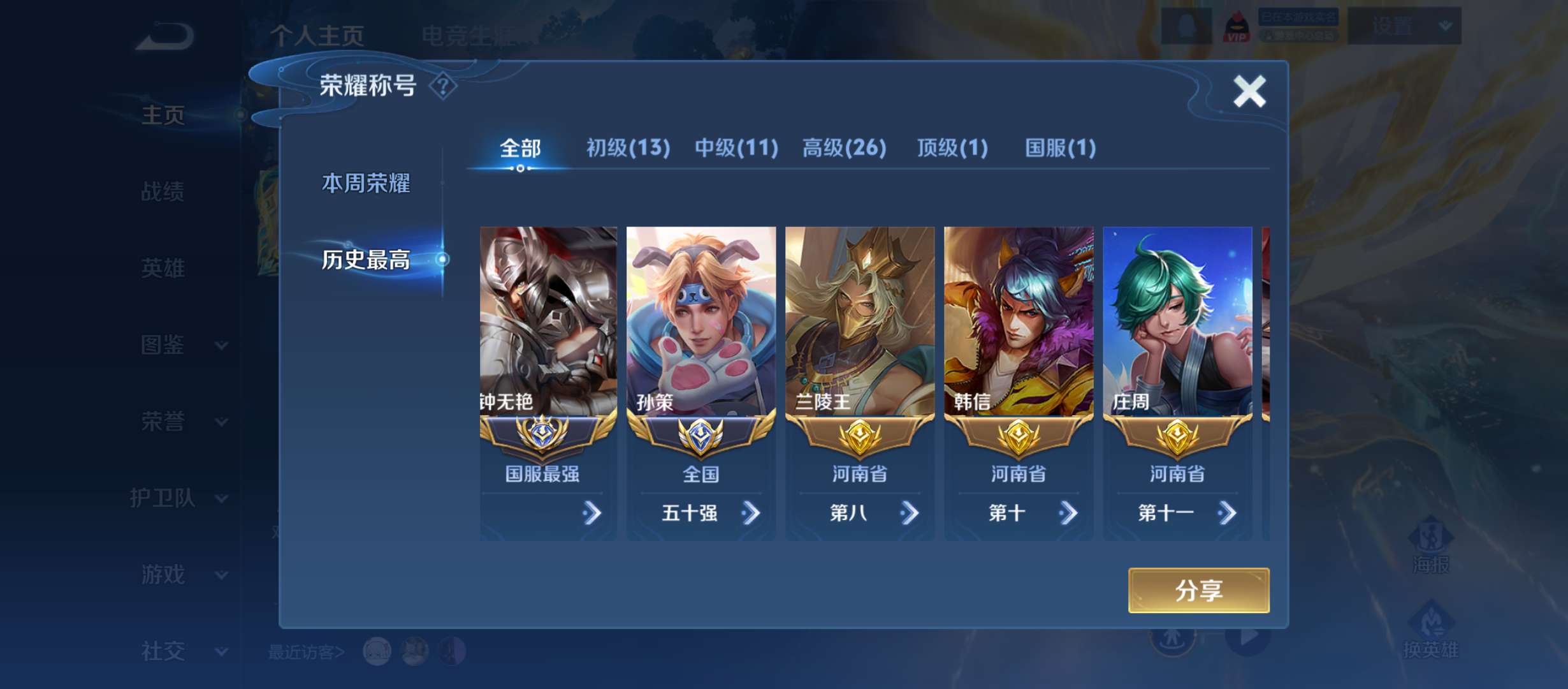 现在107个皮肤,可小刀,要的扣,大国标钟无艳🔥小国标孙策,26个省标🔥,打野41段🔥男神号