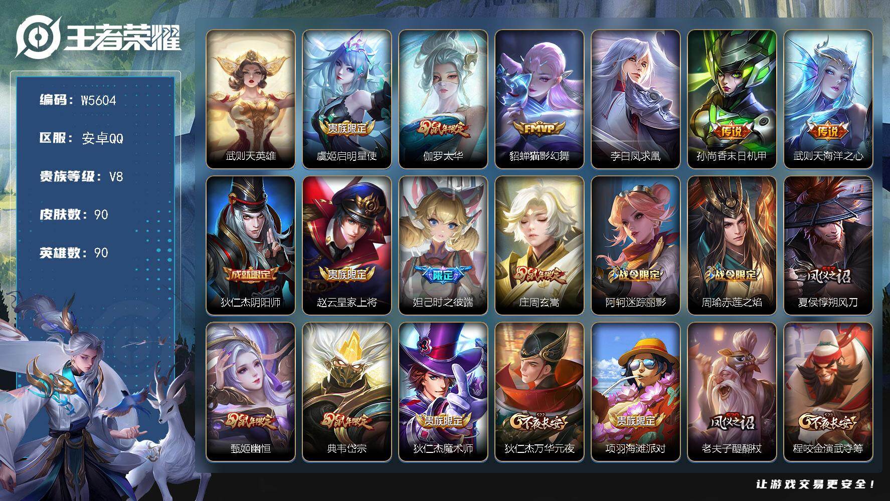 安卓Q区-可二次-贵8-90英雄-90皮肤-1典藏(武则天)-6传说-230幸运值