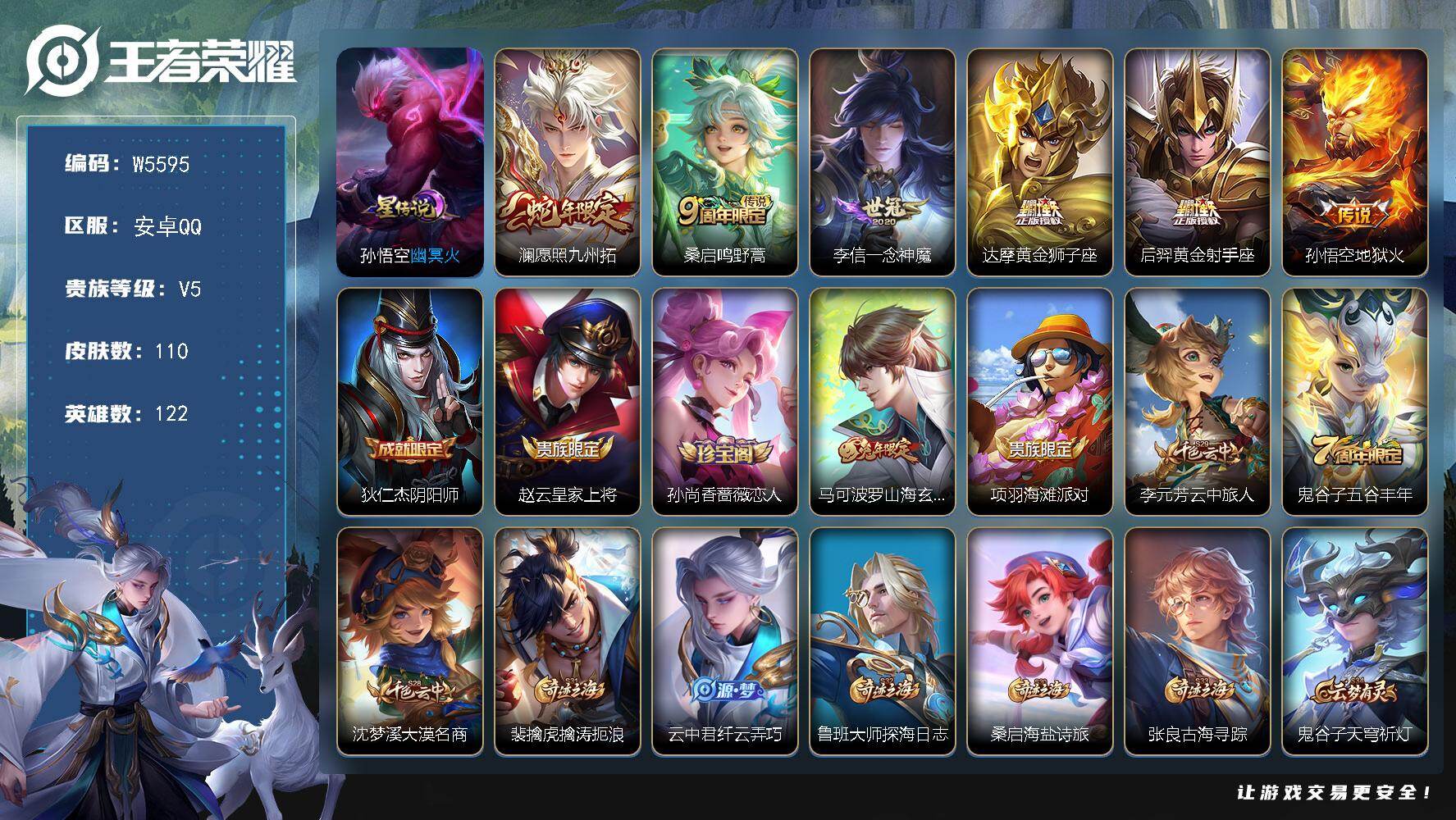 安卓Q区-无二次-贵5-122英雄-110皮肤-6传说-25史诗-28限定-1星元-4按键