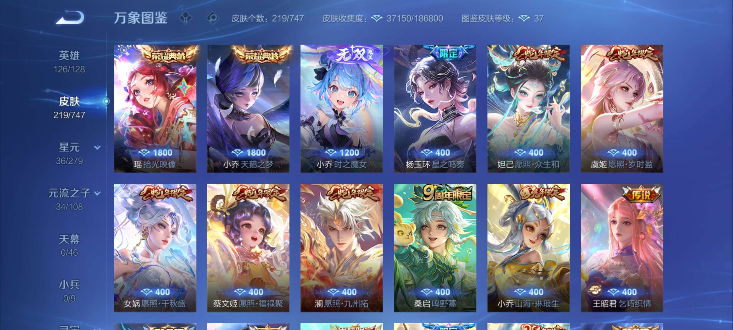 皮肤244 英雄126 永恒钻石 荣耀典藏1 珍品无双1 珍品传说2 传说11 其他皮肤97-
