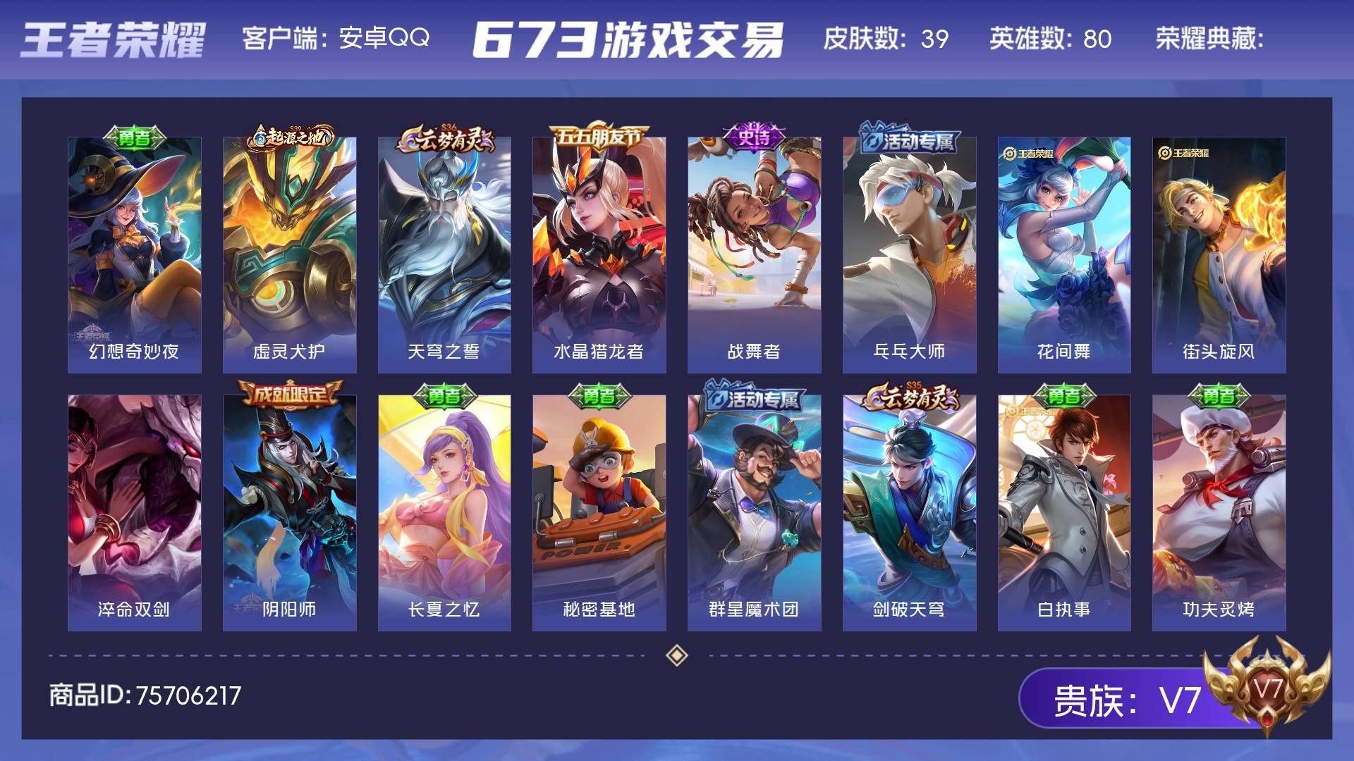 贵族等级: V7 英雄数: 124 皮肤数: 182 荣耀水晶: 星域神启 星
