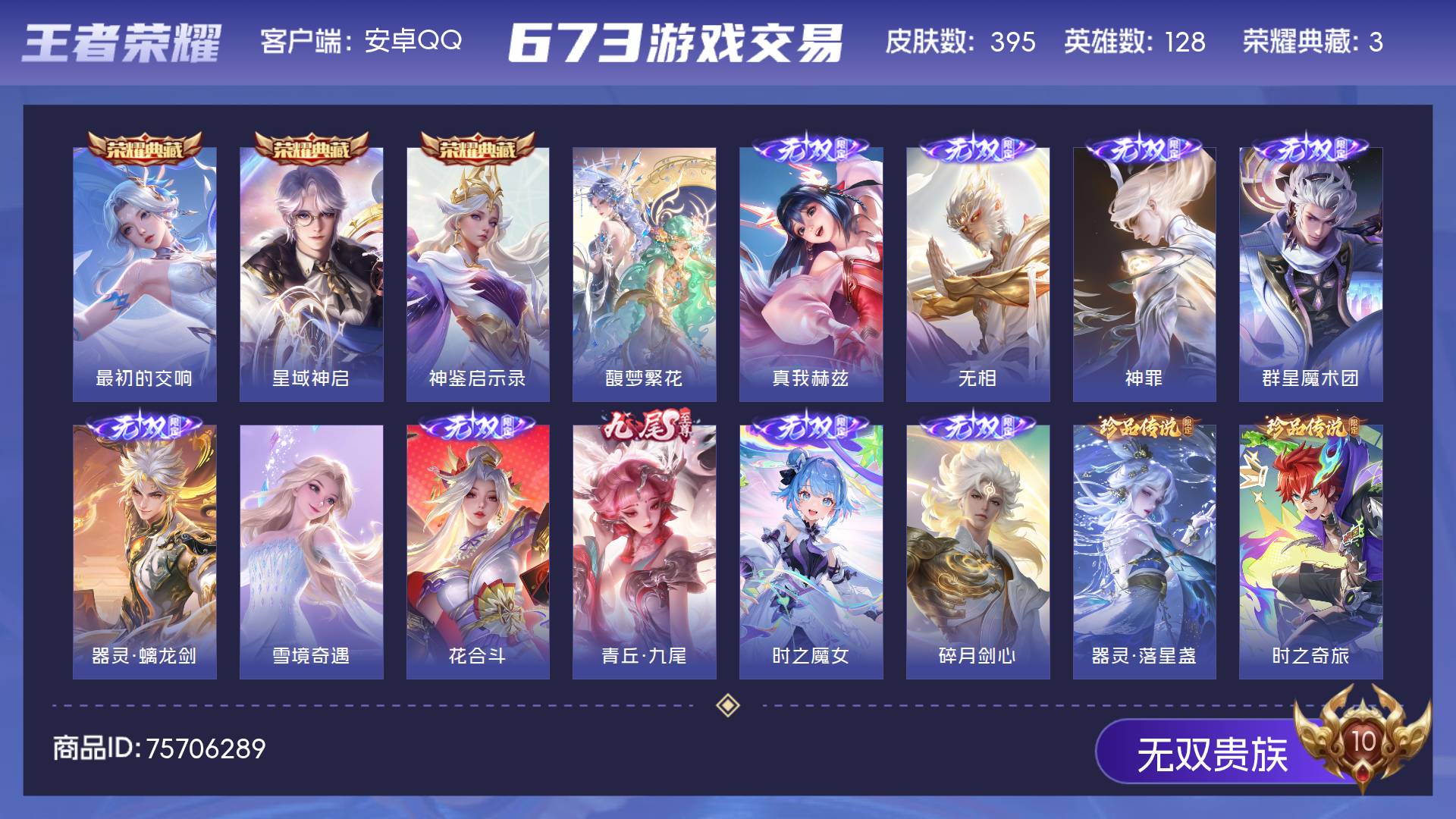 无双贵族 皮肤395 英雄128 至尊星耀 荣耀典藏3 珍品无双1 无双皮肤10 珍品传说3 星传说4 传说65 其他皮肤313