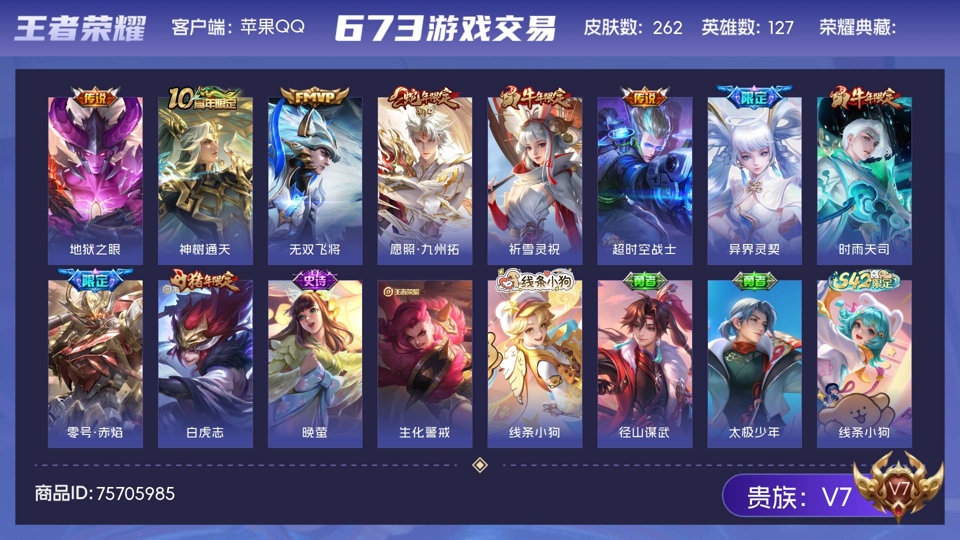V7 皮肤262 英雄127 至尊星耀 传说10 其他皮肤258