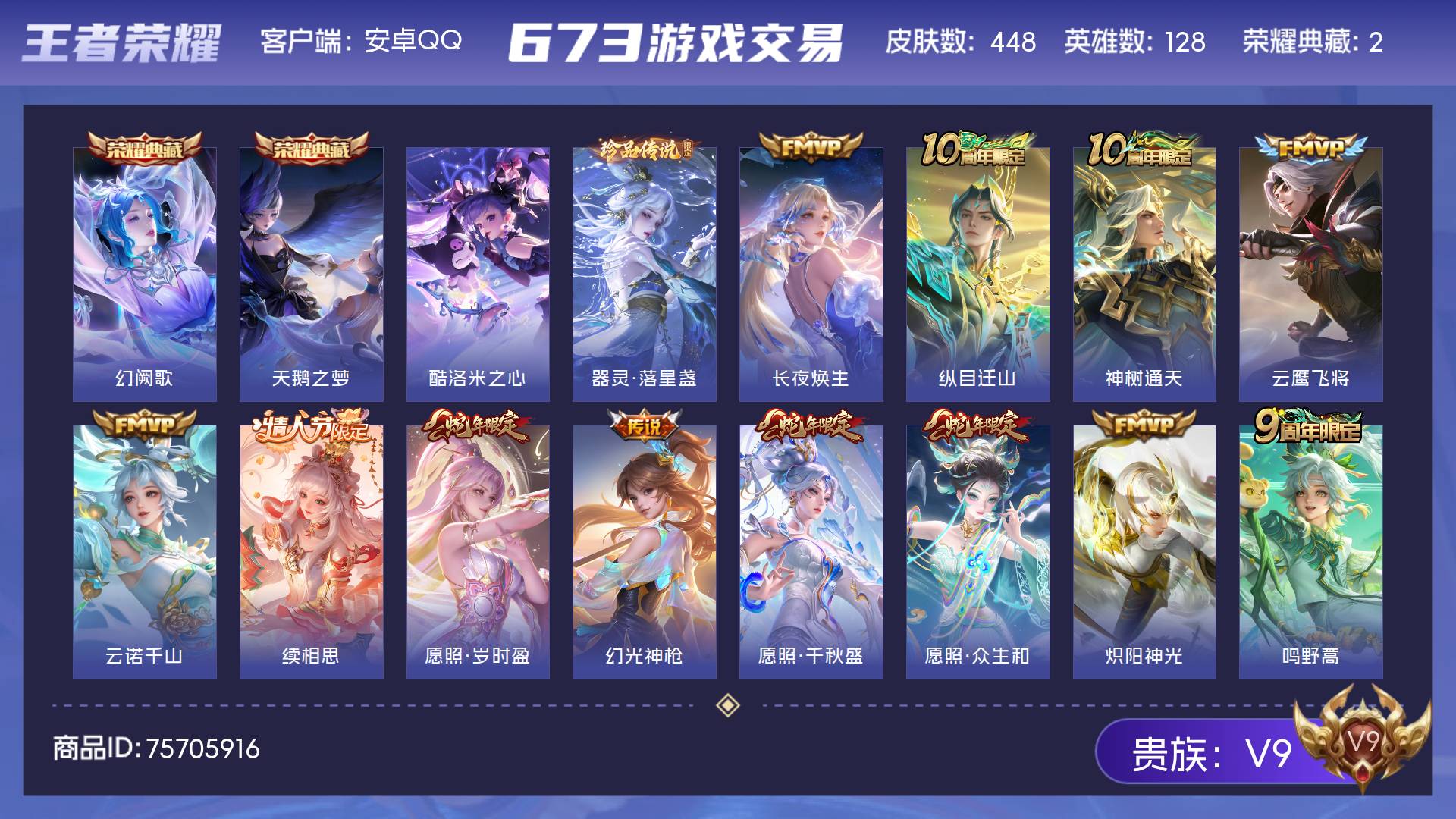 V9 皮肤448 英雄128 至尊星耀 荣耀典藏2 珍品传说2 传说44 其他皮肤406