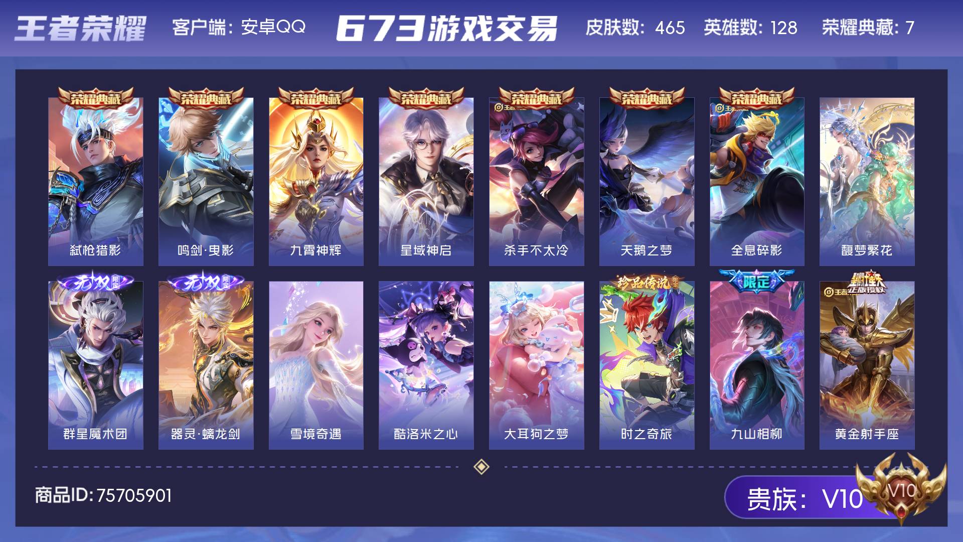 V10 皮肤465 英雄128 永恒钻石 荣耀典藏7 珍品无双1 无双皮肤3 珍品传说3 传说53 其他皮肤405