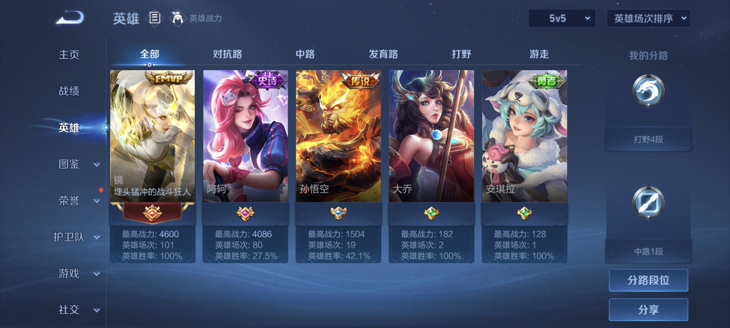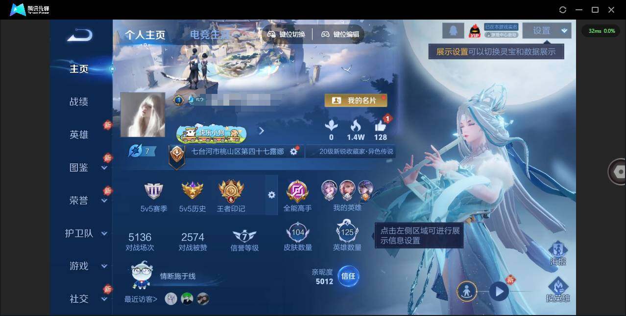 贵族等级: V5 英雄数: 125 皮肤数: 104 传说皮: 云鹰飞将,炽阳