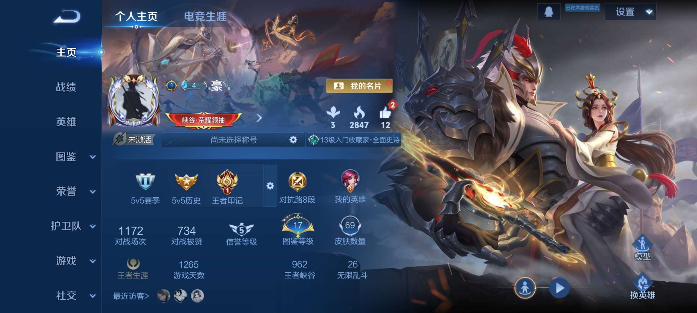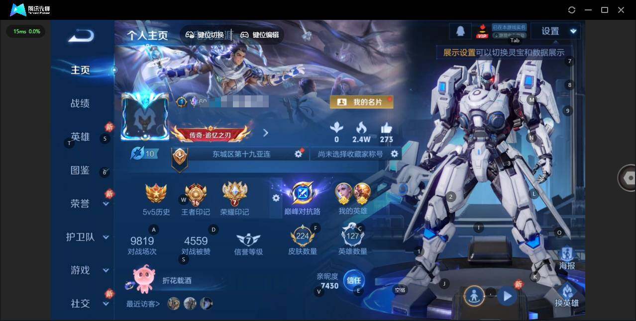 实名: 可修改 贵族等级: V8 英雄数: 127 皮肤数: 290 荣耀水晶