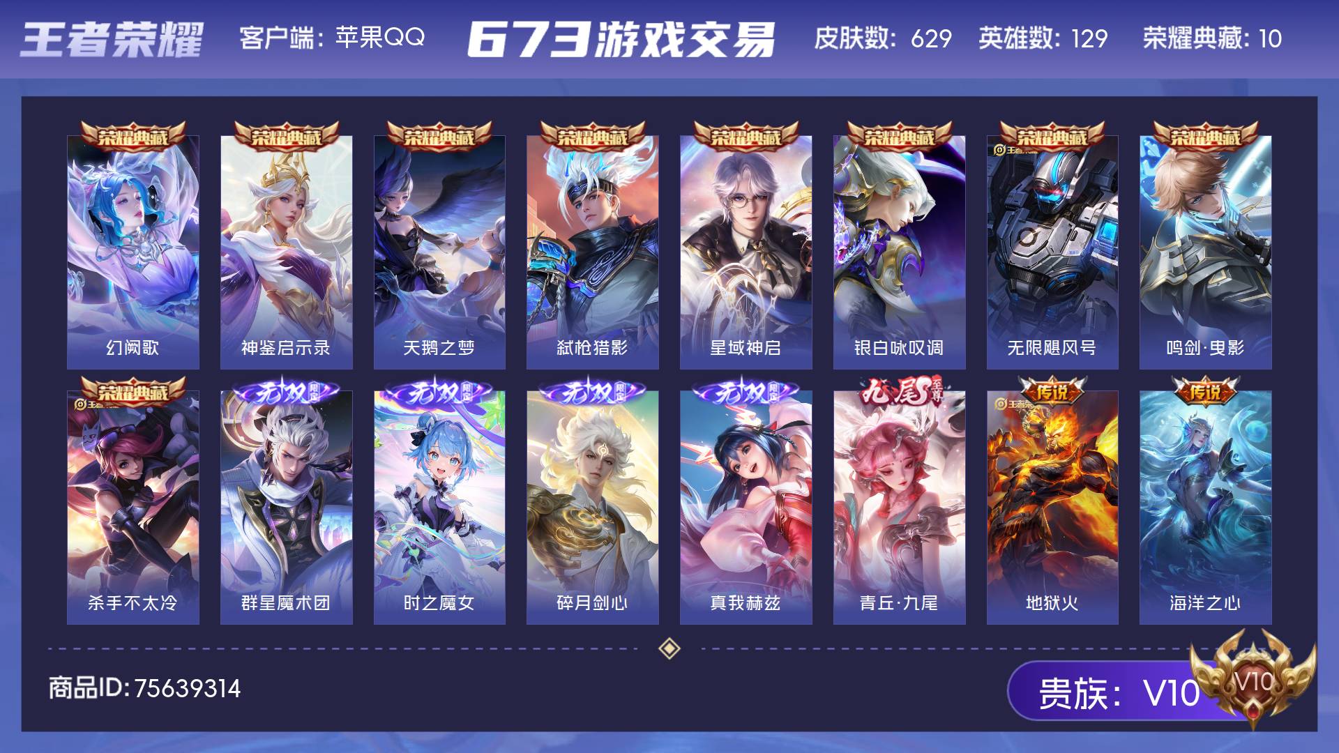 V10 皮肤629 英雄129 传奇王者 荣耀典藏10 无双皮肤5 传说108 其他皮肤508