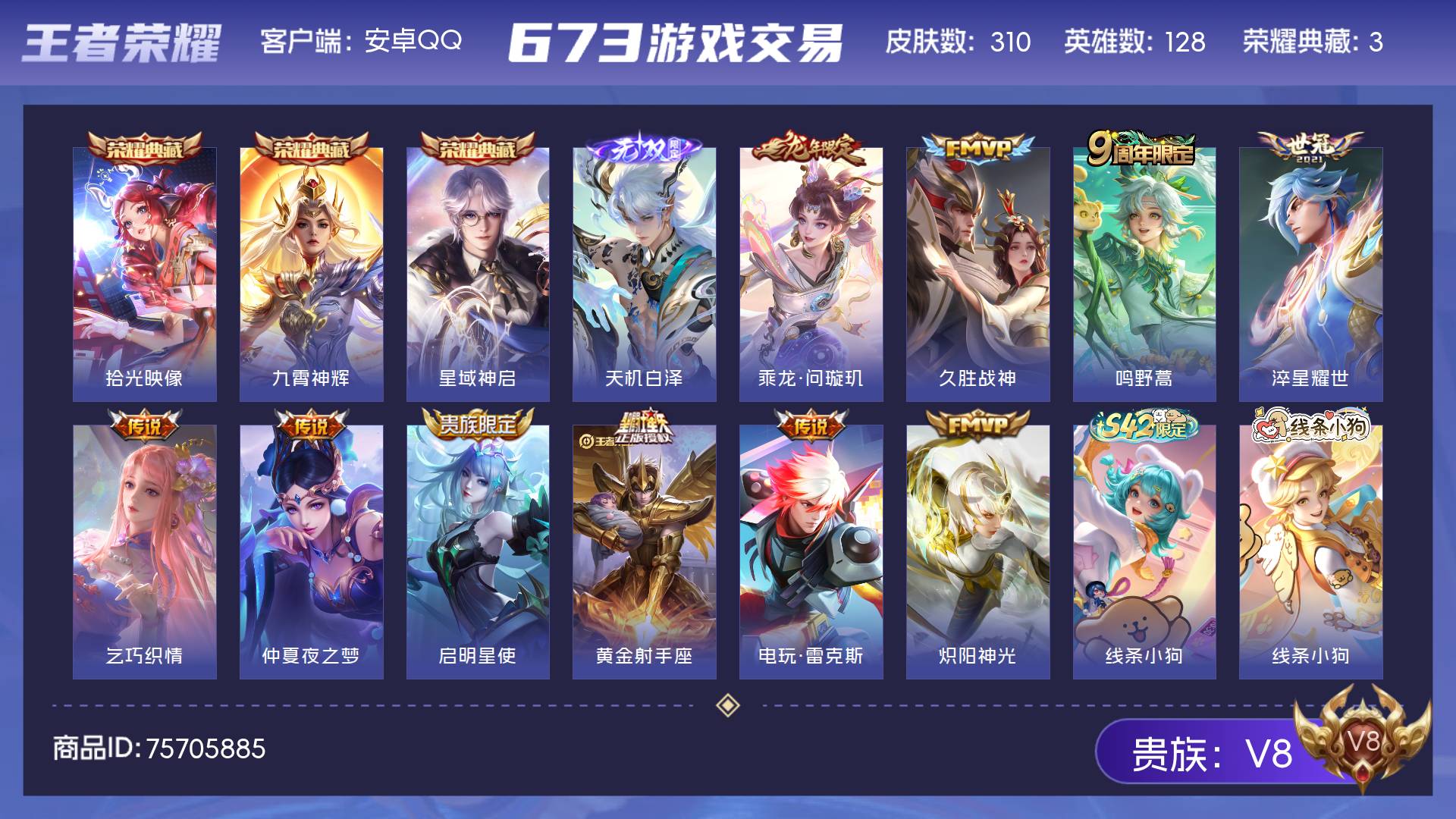 V8 皮肤310 英雄128 永恒钻石 荣耀典藏3 无双皮肤1 传说10 其他皮肤302
